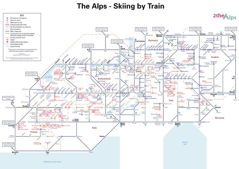 Much like the iconic topological London Underground Map, this schematic style map sets out to simplify rail journeys to and through the Alps. Featuring 200 ski resorts across seven Alpine countries, it shows access cable cars, mountain railways, main lines and the Eurostar route, making it easy for adventurous travellers to plan their own independent journey to the mountains.