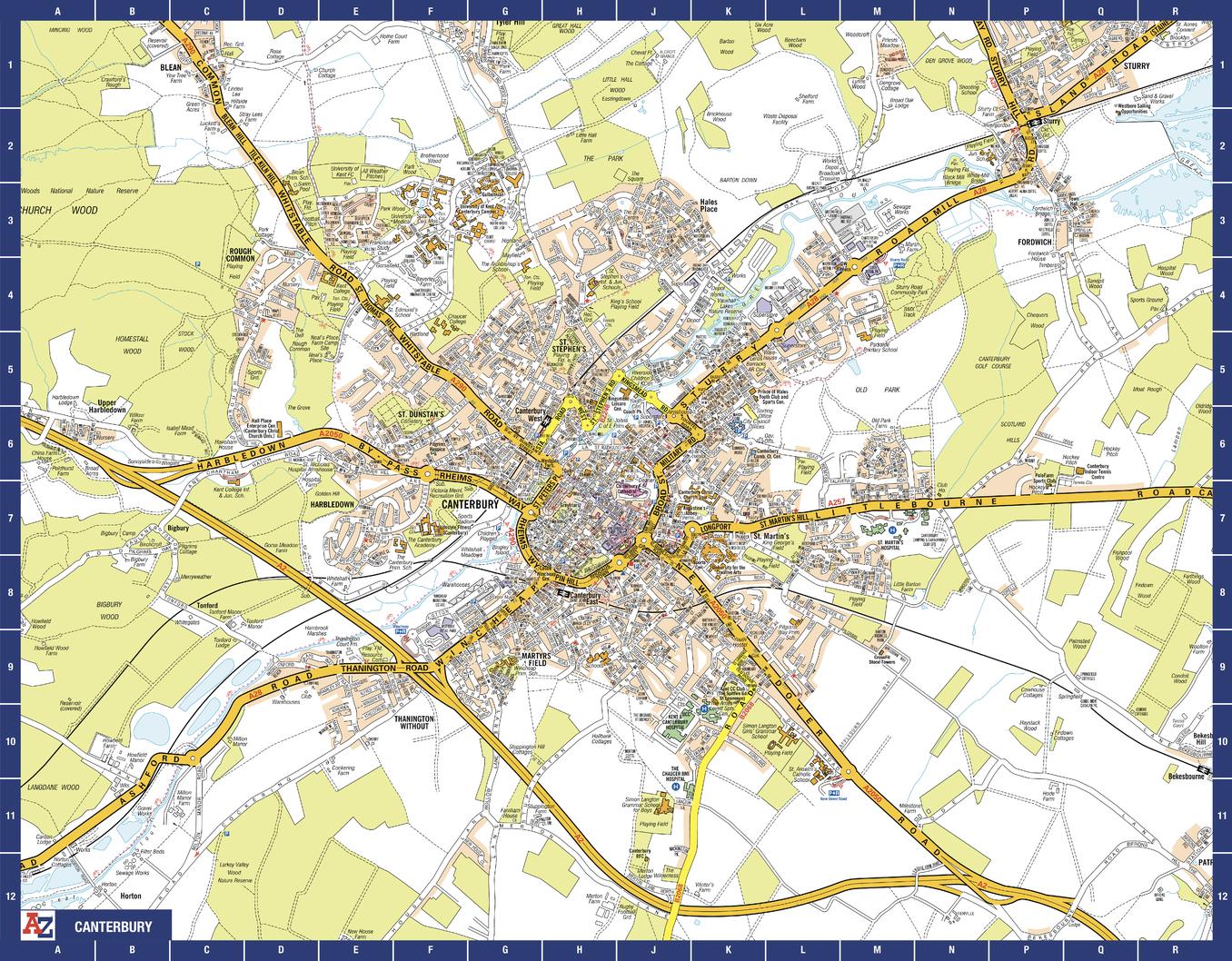The perfect reference map for finding your way around Canterbury. This up-to-date detailed A-Z town plan includes more than 1,000 streets in and around Canterbury. As well as the Canterbury Cathedral and Canterbury city centre, other areas covered are Blean Woods National Nature Reserve, Chartham, Harbledown, Rough Common, University of Kent and Fordwich. The highly detailed 1 mile to 5.5 inch street map includes places of interest, among other features.