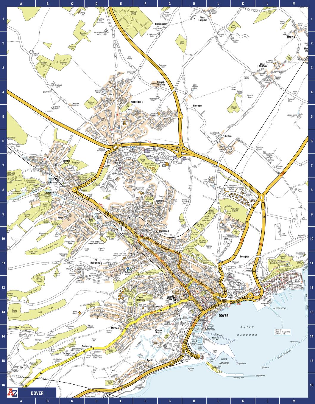 The perfect reference map for finding your way around Dover. This up-to-date detailed A-Z town plan includes more than 800 streets in and around Dover. Detailed coverage of an area extending from Napchester in the north to the harbour in the south, and from beyond Jubilee Way to the east and Kearsney in the west. The highly detailed 1 mile to 4.5 inch street map includes places of interest, among other features.