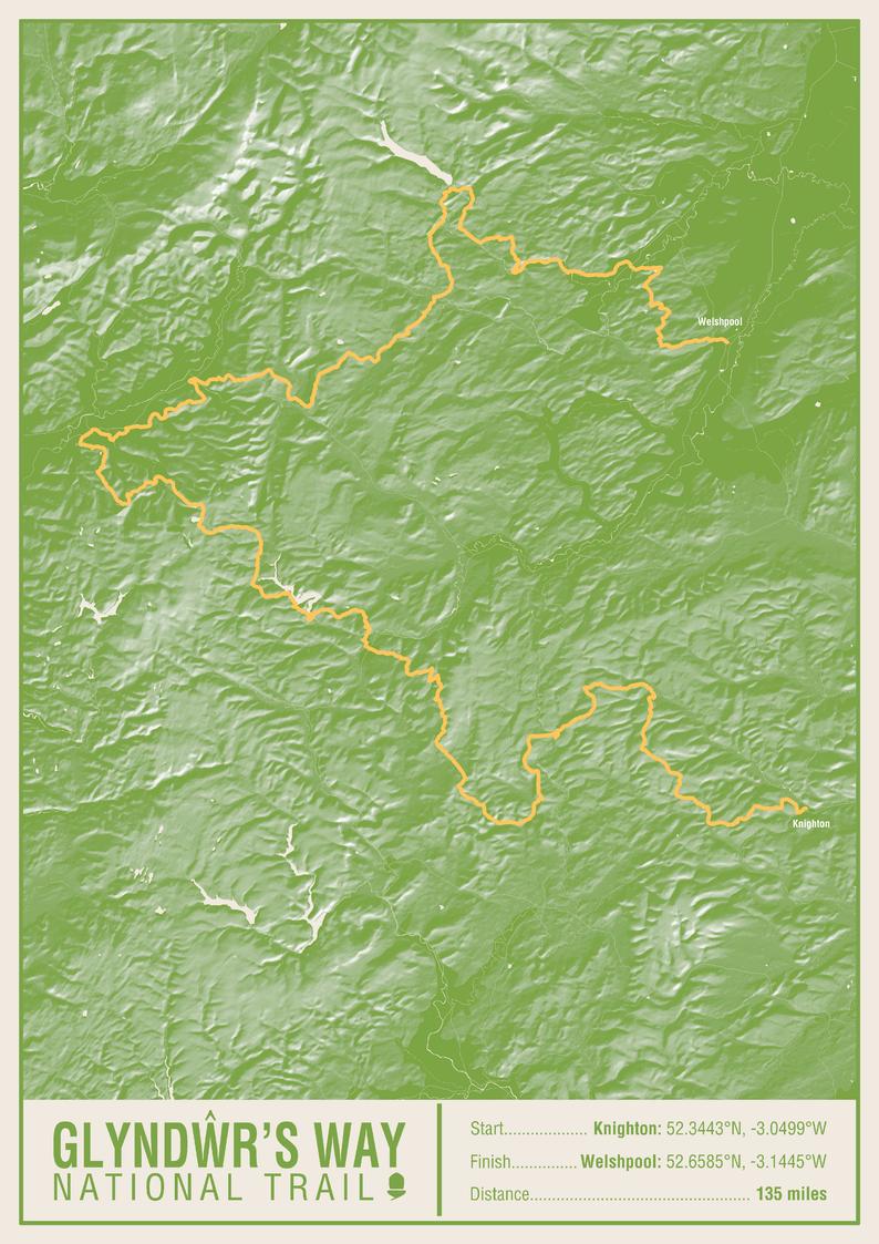 This map print highlights the National Trail route of the Glyndwr's Way, showing the start and finish points on an attractive relief base and created in the official National Trail colours.