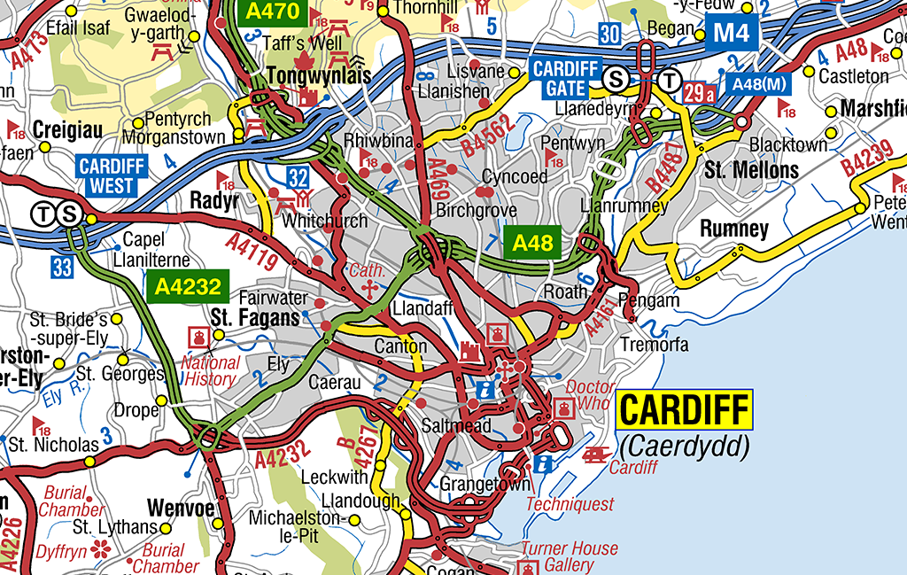 The Great Britain A-Z road map is a detailed full colour road map of Great Britain. The following features are shown on the road mapping: motorways with full junction detail; service areas; primary routes and destinations; A & B roads, selected minor roads; gradients 1:5 and steeper; tolls; mileages; national and county boundaries; and spot heights. A wide range of ancillary and tourist information, including points of interest such as golf courses, castles and country parks are included on the map.