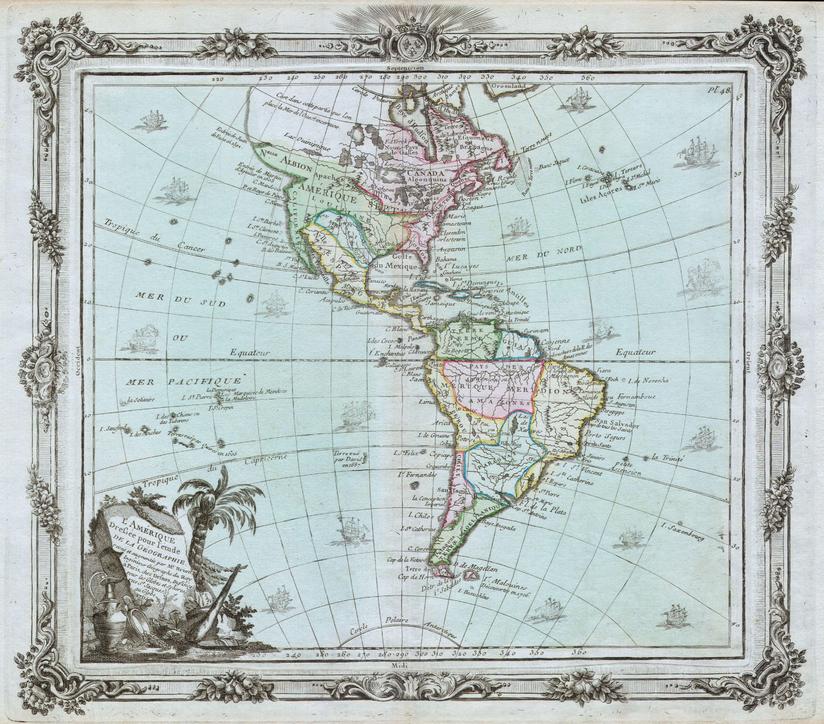 1764 map of North and South America by French geographer Louis Brion de la Tour. Full title: L'Amérique Dressée for l'étude de la Géographie.