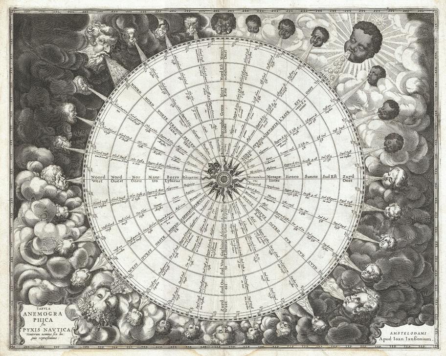 1650 Anemographic chart (map of the winds) by Dutch cartographer Johannes Janssonius. Full title: Tabula Anemographica seu Pyxis Nautica ventorum nomina sex linguis repraesentans
