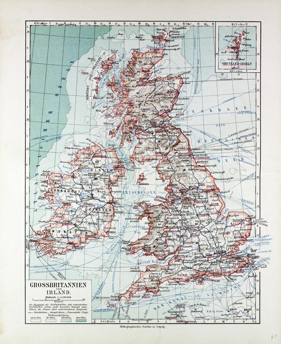 1899 map of Great Britain and Ireland in German showing sea depth and indications of relief on land by German publisher Bibliographisches Institut in Leipzig: Full title: Grossbritannien und Ireland.