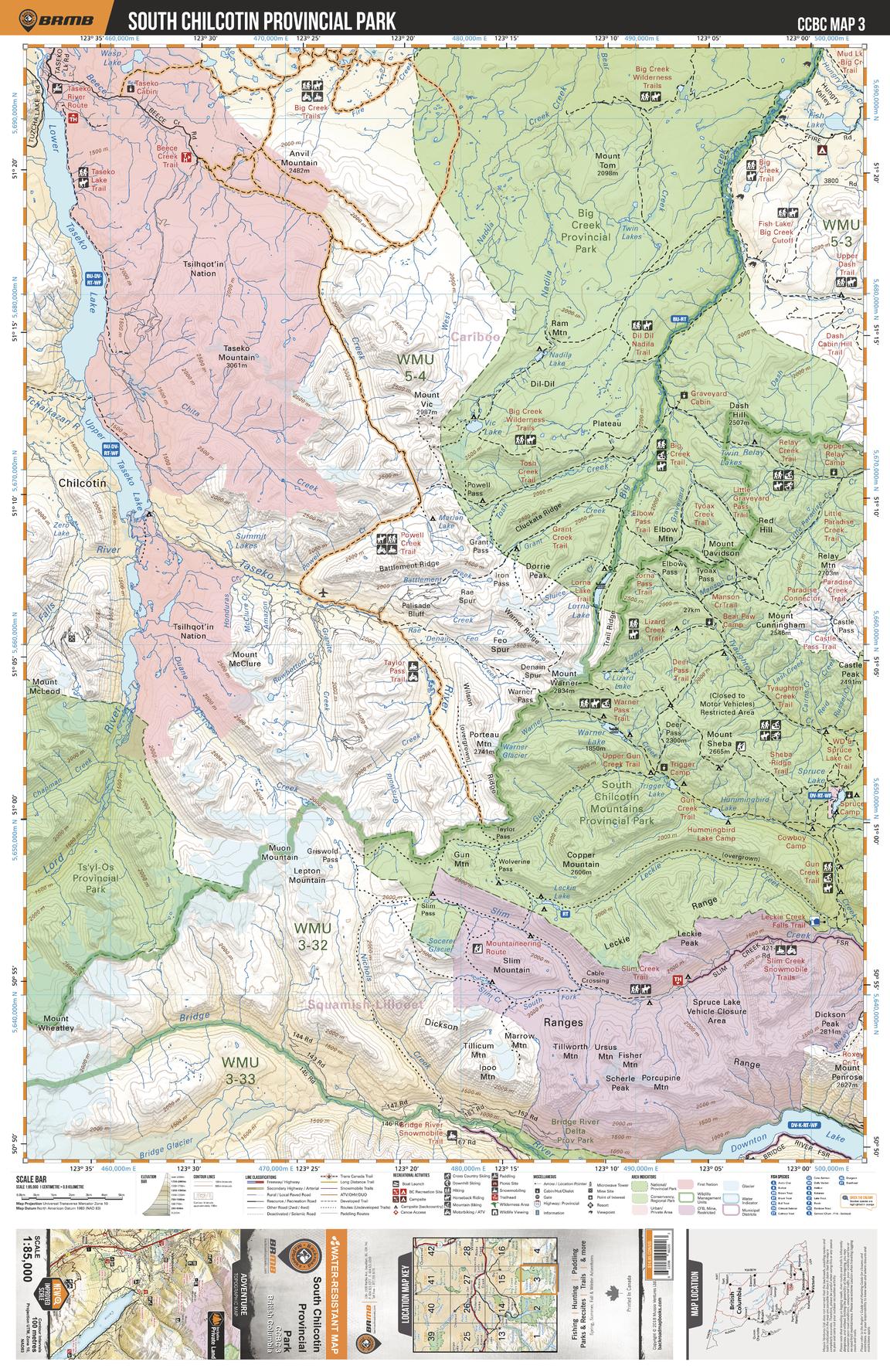 This recreation topographic map for the South Chilcotin Provincial Park area highlights all the logging roads, trails and recreational Points of Interest including hunting, camping, hiking, mountain biking, canoeing, kayaking, backcountry skiing, wildlife viewing, ATVing, snowmobiling and more. No other map provides you with this level of recreational and topographic detail for the Homathko River area. Covering the South Chilcotin Prov Park, Big Creek Prov Park, Summit Lakes, Bridge River, Slim Creek, Spruce Lake, Taseko River, Ts'yl-Os Prov Park, Lower Taseko Lake, Upper Taseko Lake and more, this map contains new features such as private land and labelled fish species. The 1:85,000 scale map covers 3,040 km2 (1,175 mi2), measuring 50 x 63.5 km (30 x 39.5 mi).