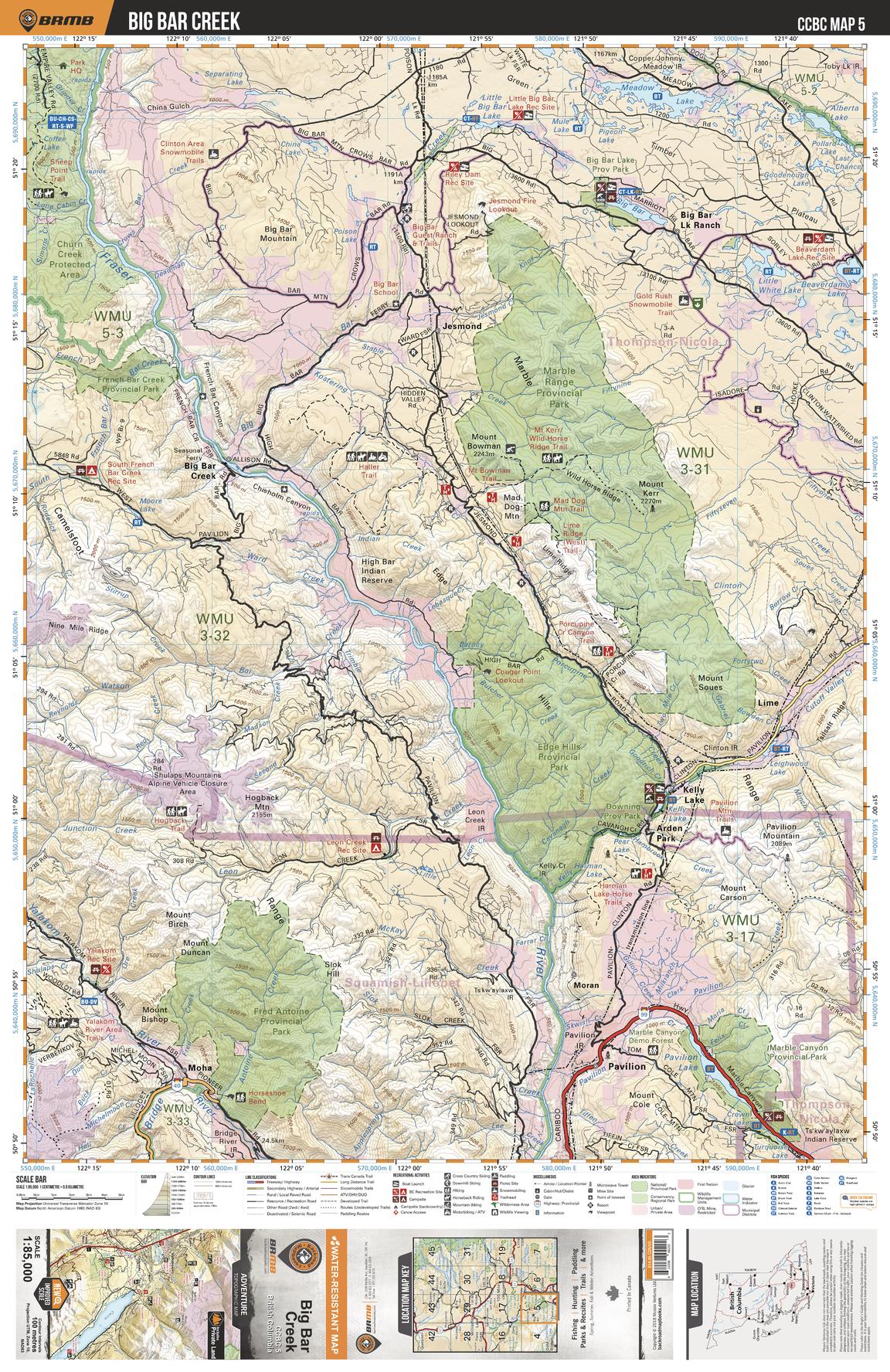 This recreation topographic map for the Big Bar Creek area highlights all the logging roads, trails and recreational Points of Interest including hunting, camping, hiking, mountain biking, canoeing, kayaking, backcountry skiing, wildlife viewing, ATVing, snowmobiling and more. No other map provides you with this level of recreational and topographic detail for the Homathko River area. Covering the Big Bar Creek, Moha, Pavilion, Big Bar Lake Ranch, Jesmond, Marble Range Prov Park, Edge Hills Prov Park, Churn Creek Protected Area, Hogback Mtn, Fraser River and more, this map contains new features such as private land and labelled fish species. The 1:85,000 scale map covers 3,040 km2 (1,175 mi2), measuring 50 x 63.5 km (30 x 39.5 mi).