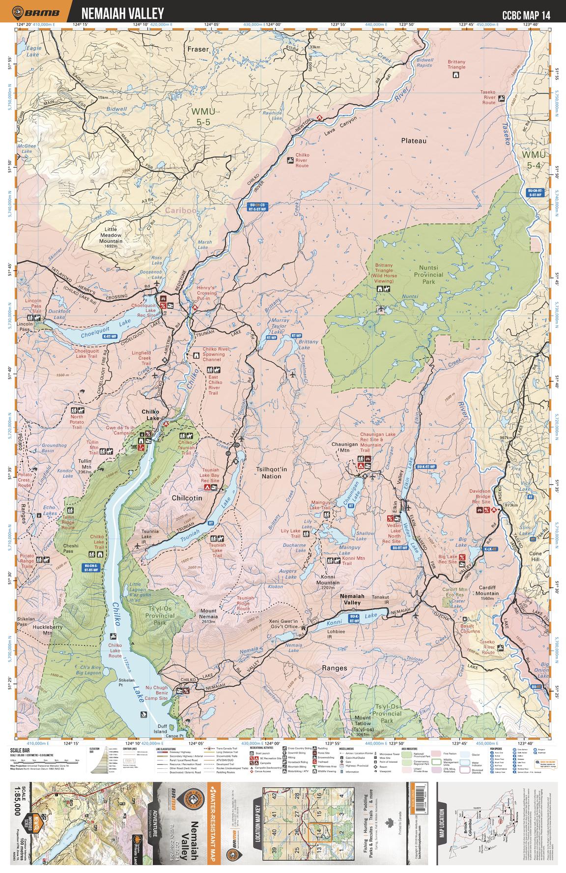 This recreation topographic map for the Nemaiah Valley area highlights all the logging roads, trails and recreational Points of Interest including hunting, camping, hiking, mountain biking, canoeing, kayaking, backcountry skiing, wildlife viewing, ATVing, snowmobiling and more. No other map provides you with this level of recreational and topographic detail for the Homathko River area. Covering the Chilko Lake, Ts'yl-Os Prov Park, Nuntsi Prov Park, Choelquoit Lake, Chilko River, Chaunigan Lake, Taseko River, Tsuniah Lake, Konni Lake, Nemaiah Valley and more, this map contains new features such as private land and labelled fish species. The 1:85,000 scale map covers 3,040 km2 (1,175 mi2), measuring 50 x 63.5 km (30 x 39.5 mi).