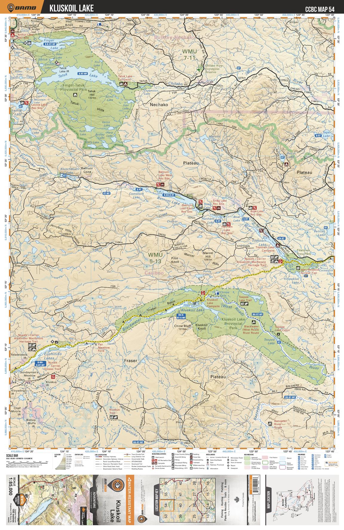 This recreation topographic map for the Kluskoil Lake area highlights all the logging roads, trails and recreational Points of Interest including hunting, camping, hiking, mountain biking, canoeing, kayaking, backcountry skiing, wildlife viewing, ATVing, snowmobiling and more. No other map provides you with this level of recreational and topographic detail for the Homathko River area. Covering the Finger Tatuk Prov Park, Tatuk Lake, Finger Lake, Kluskoil Lake, Euchiniko Lakes, Kluskoil Lake Prov Park, Titetown Lake, Blackwater River, Euchiniko River, Batnuni Lake and more, this map contains new features such as private land and labelled fish species. The 1:85,000 scale map covers 3,040 km2 (1,175 mi2), measuring 50 x 63.5 km (30 x 39.5 mi).
