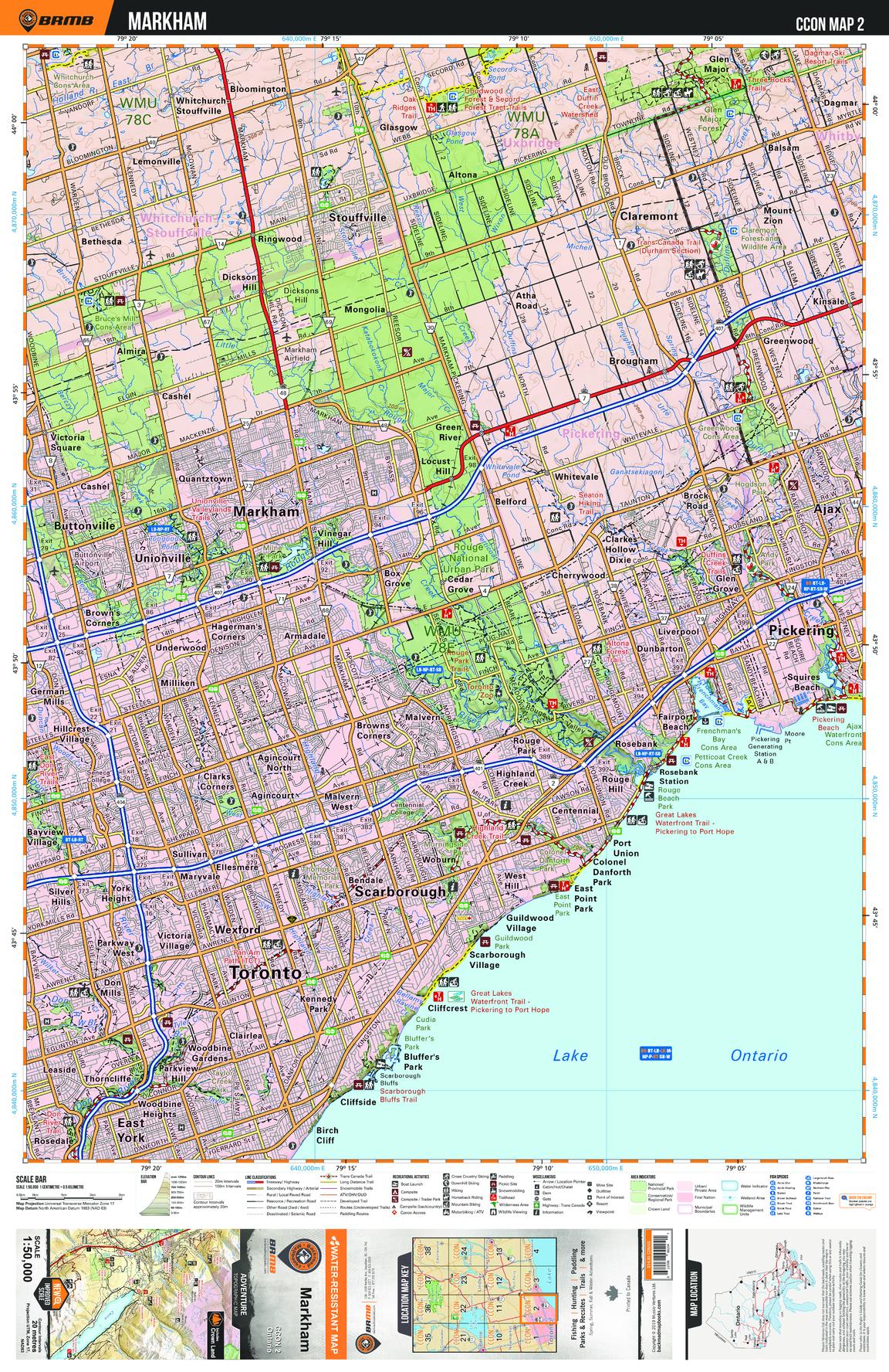 This recreation topographic map for Markham highlights all the logging/resource roads, hunting areas, fishing lakes & streams, campsites, paddling routes for canoeing and kayaking, wildlife viewing areas, multi-use trails for hiking, biking, horseback riding, cross-country skiing and snowshoeing, motorized trails for ATVing and snowmobiling & more. Covering 1,090 km2 (420 mi2), this 1:50,000 scale map measures 29 x 38 km (18 x 24 mi), providing you with more topographic and recreational detail for the Richmond Hill area than any other map on the market. New features include enhanced Crown land, countless new roads and trails and a wealth of recreational Points of Interest. Included on this map are Toronto, Markham, Scarborough, Claremont, East York, Pickering and more!