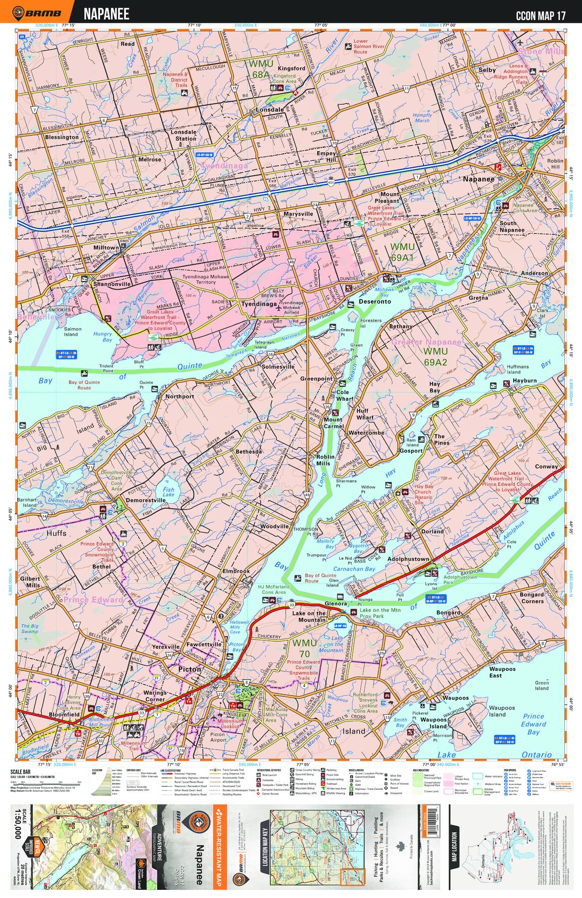 This recreation topographic map for Napanee highlights all the logging/resource roads, hunting areas, fishing lakes & streams, campsites, paddling routes for canoeing and kayaking, wildlife viewing areas, multi-use trails for hiking, biking, horseback riding, cross-country skiing and snowshoeing, motorized trails for ATVing and snowmobiling & more. Covering 1,090 km2 (420 mi2), this 1:50,000 scale map measures 29 x 38 km (18 x 24 mi), providing you with more topographic and recreational detail for the Richmond Hill area than any other map on the market. New features include enhanced Crown land, countless new roads and trails and a wealth of recreational Points of Interest. Included on this map are Napanee, Picton, Bay, Kingsford, Northport, Lake Ontario Waterfront Trail and more!