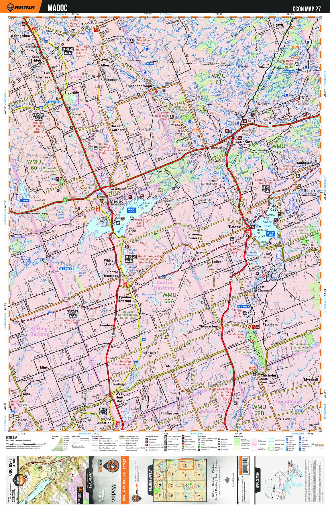 This recreation topographic map for Madoc highlights all the logging/resource roads, hunting areas, fishing lakes & streams, campsites, paddling routes for canoeing and kayaking, wildlife viewing areas, multi-use trails for hiking, biking, horseback riding, cross-country skiing and snowshoeing, motorized trails for ATVing and snowmobiling & more. Covering 1,090 km2 (420 mi2), this 1:50,000 scale map measures 29 x 38 km (18 x 24 mi), providing you with more topographic and recreational detail for the Richmond Hill area than any other map on the market. New features include enhanced Crown land, countless new roads and trails and a wealth of recreational Points of Interest. Included on this map are Madoc, Tweed, Queensborough, Actinolite, Hastings, Trail, Moneymore and more!