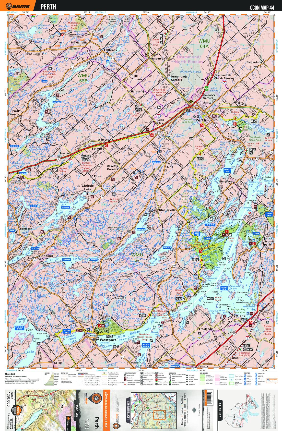 This recreation topographic map for Perth highlights all the logging/resource roads, hunting areas, fishing lakes & streams, campsites, paddling routes for canoeing and kayaking, wildlife viewing areas, multi-use trails for hiking, biking, horseback riding, cross-country skiing and snowshoeing, motorized trails for ATVing and snowmobiling & more. Covering 1,090 km2 (420 mi2), this 1:50,000 scale map measures 29 x 38 km (18 x 24 mi), providing you with more topographic and recreational detail for the Richmond Hill area than any other map on the market. New features include enhanced Crown land, countless new roads and trails and a wealth of recreational Points of Interest. Included on this map are Perth, Freeland, Christie Lake, Westport, Scotch Line, Portland and more!
