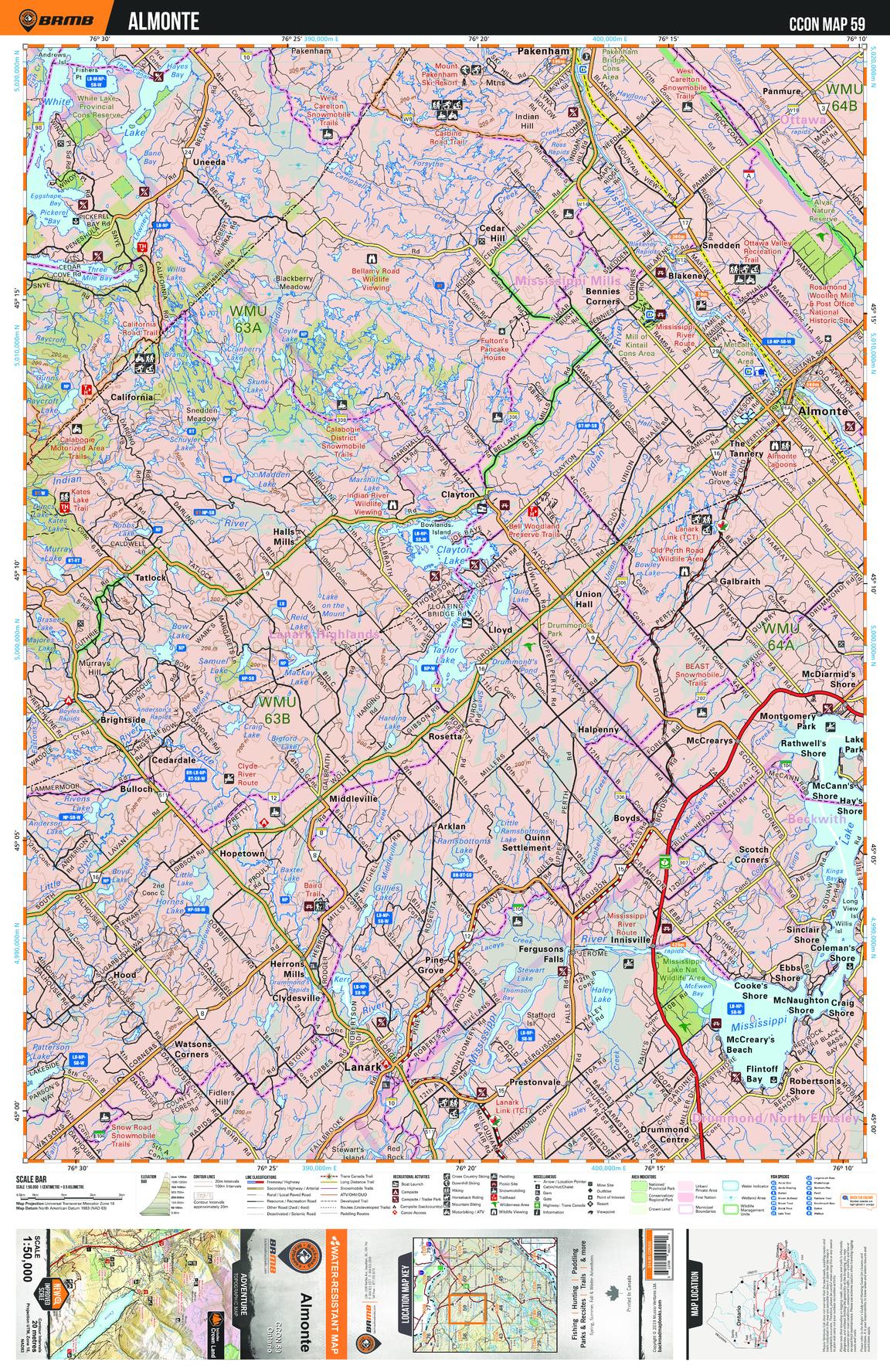 This recreation topographic map for Almonte highlights all the logging/resource roads, hunting areas, fishing lakes & streams, campsites, paddling routes for canoeing and kayaking, wildlife viewing areas, multi-use trails for hiking, biking, horseback riding, cross-country skiing and snowshoeing, motorized trails for ATVing and snowmobiling & more. Covering 1,090 km2 (420 mi2), this 1:50,000 scale map measures 29 x 38 km (18 x 24 mi), providing you with more topographic and recreational detail for the Richmond Hill area than any other map on the market. New features include enhanced Crown land, countless new roads and trails and a wealth of recreational Points of Interest. Included on this map are Almonte, Middleville, Hopetown, Lanark, Pakenham, Boyds, Shore and more!