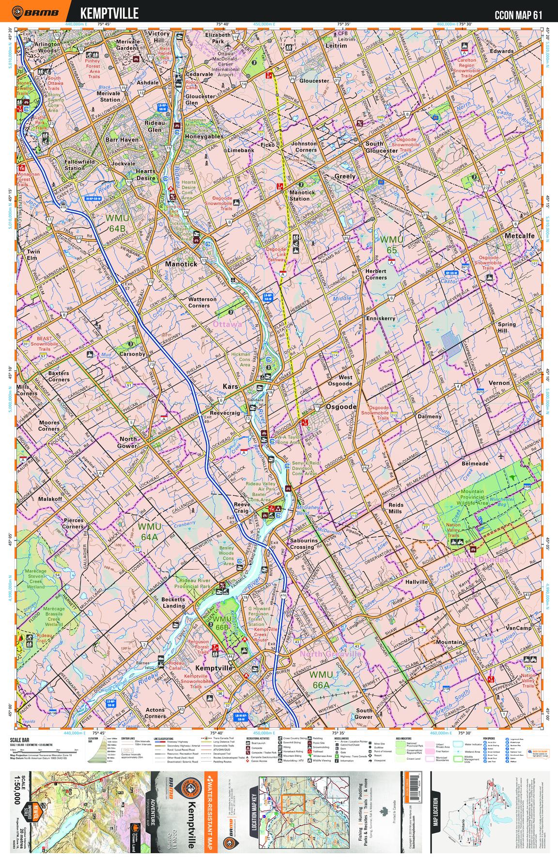 This recreation topographic map for Kemptville highlights all the logging/resource roads, hunting areas, fishing lakes & streams, campsites, paddling routes for canoeing and kayaking, wildlife viewing areas, multi-use trails for hiking, biking, horseback riding, cross-country skiing and snowshoeing, motorized trails for ATVing and snowmobiling & more. Covering 1,090 km2 (420 mi2), this 1:50,000 scale map measures 29 x 38 km (18 x 24 mi), providing you with more topographic and recreational detail for the Richmond Hill area than any other map on the market. New features include enhanced Crown land, countless new roads and trails and a wealth of recreational Points of Interest. Included on this map are Kemptville, Osgoode, North Gower, Greely, Manotick, Metcalfe and more!