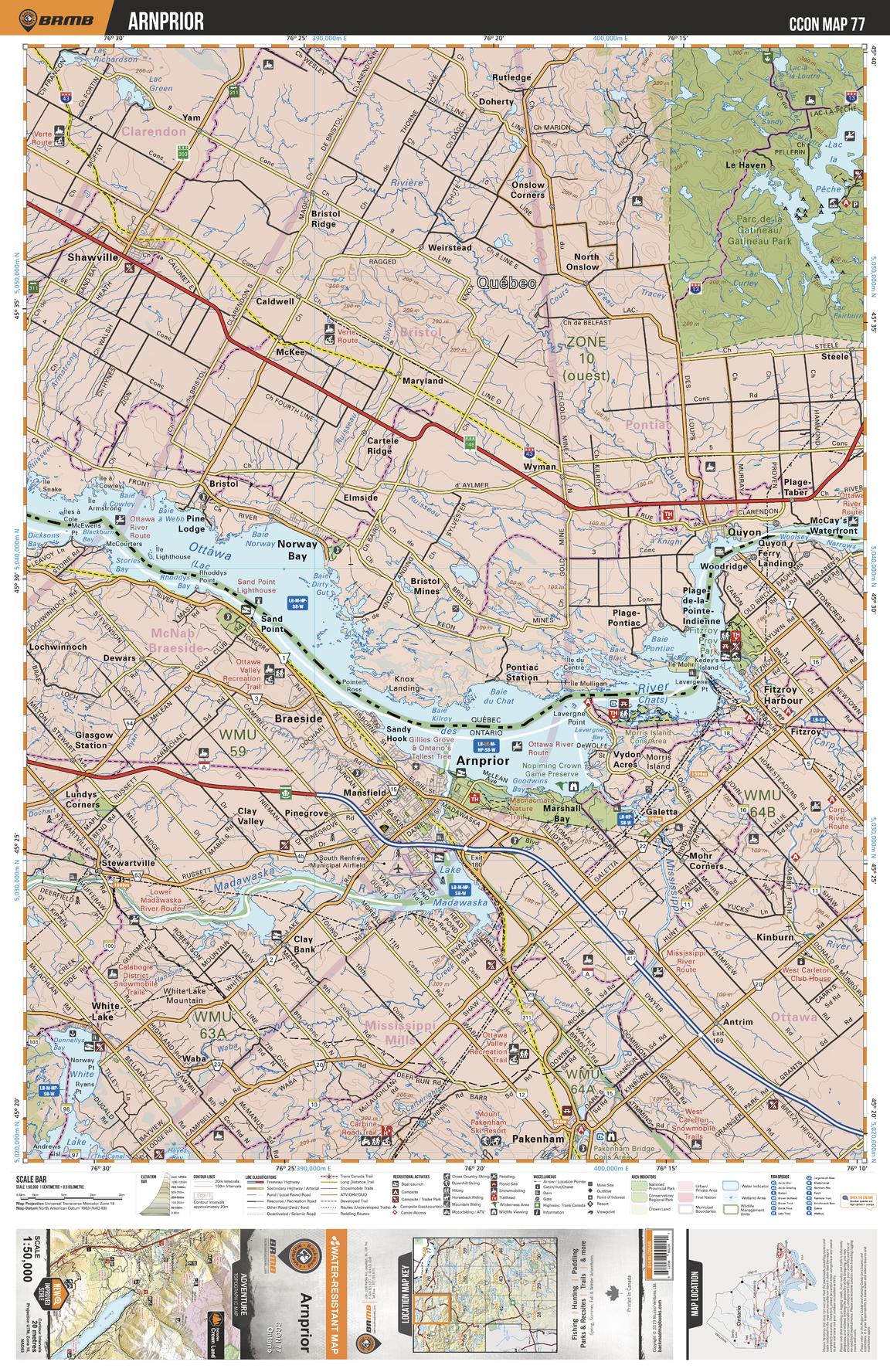 This recreation topographic map for Arnprior highlights all the logging/resource roads, hunting areas, fishing lakes & streams, campsites, paddling routes for canoeing and kayaking, wildlife viewing areas, multi-use trails for hiking, biking, horseback riding, cross-country skiing and snowshoeing, motorized trails for ATVing and snowmobiling & more. Covering 1,090 km2 (420 mi2), this 1:50,000 scale map measures 29 x 38 km (18 x 24 mi), providing you with more topographic and recreational detail for the Richmond Hill area than any other map on the market. New features include enhanced Crown land, countless new roads and trails and a wealth of recreational Points of Interest. Included on this map are Arnprior, Braeside, Kinburn, Stewartville, Ottawa River, Fitzroy Harbour and more!