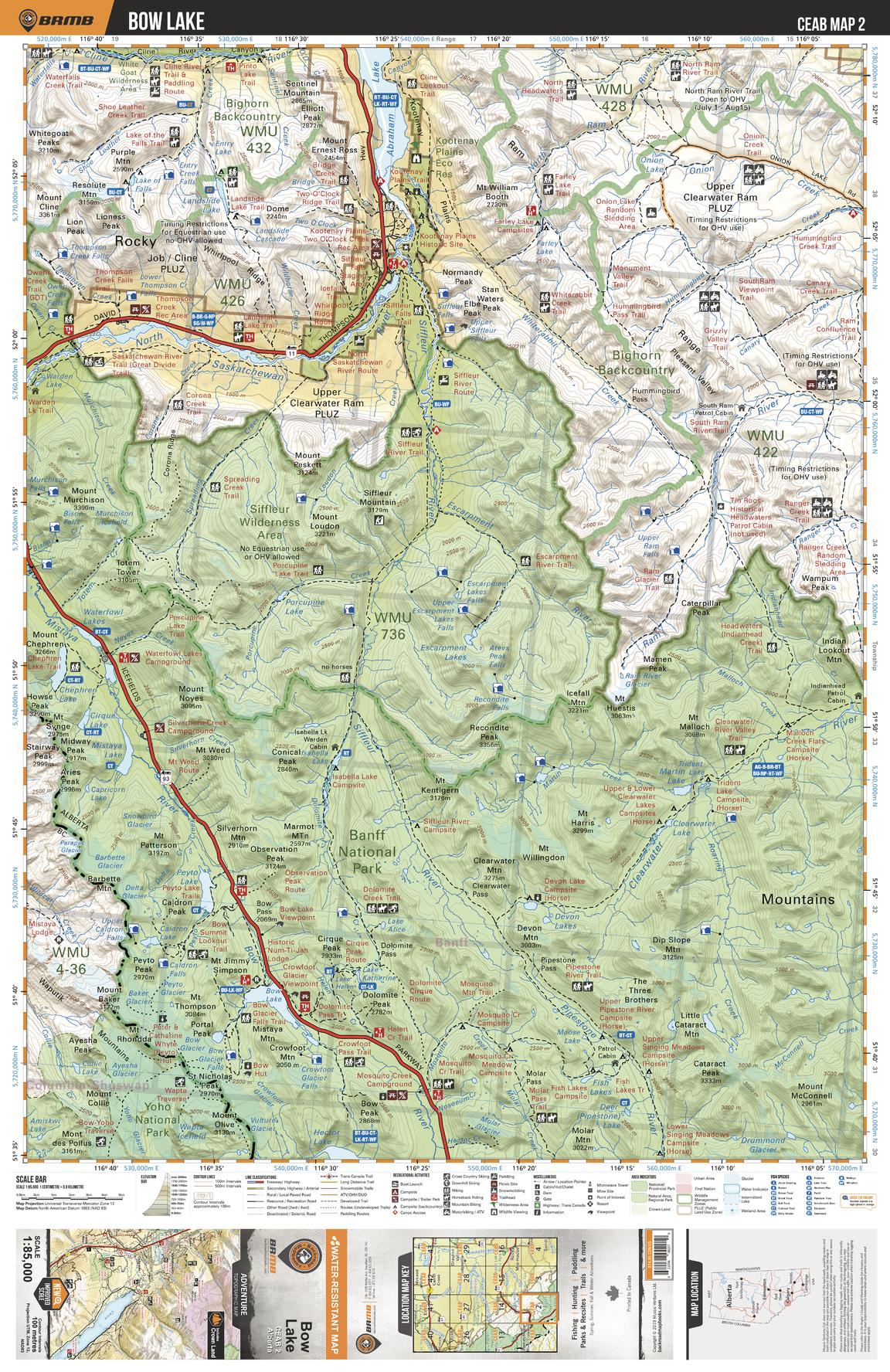 This recreation topographic map for Bow Lake highlights all the logging and resource roads, multi-use trails for hikers, mountain bikers, horseback riders, cross-country skiers and snowshoers, motorized trails for ATVers and snowmobiles, fishing lakes and rivers, recreation areas, campgrounds, day-use areas, viewpoints, backcountry campsites, work camps, oil & gas sites, backcountry huts and cabins and more. No other map for the area provides you with this level of recreational or topographic detail. Covering 3,040 km2 (1,175 mi2) in total, this 1:85,000 scale map measures 48 x 63.5 km (30 x 39.5 mi). Special features include enhanced oil & gas data plus countless roads, trails and recreational Points of Interest. This map includes Abraham Lake, North Saskatchewan River, Banff National Park, Yoho National Park, Clearwater River, Siffleur River and more!
