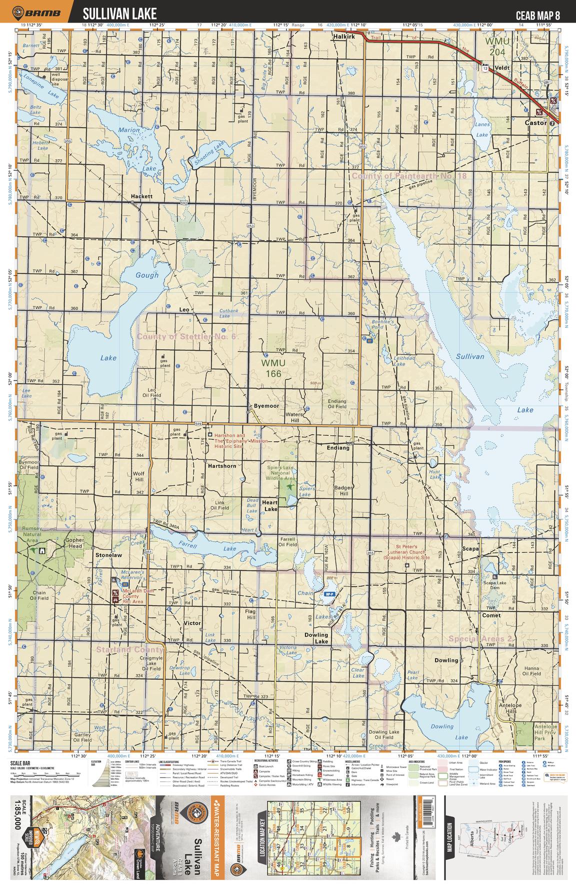 This recreation topographic map for Sullivan Lake highlights all the logging and resource roads, multi-use trails for hikers, mountain bikers, horseback riders, cross-country skiers and snowshoers, motorized trails for ATVers and snowmobiles, fishing lakes and rivers, recreation areas, campgrounds, day-use areas, viewpoints, backcountry campsites, work camps, oil & gas sites, backcountry huts and cabins and more. No other map for the area provides you with this level of recreational or topographic detail. Covering 3,040 km2 (1,175 mi2) in total, this 1:85,000 scale map measures 48 x 63.5 km (30 x 39.5 mi). Special features include enhanced oil & gas data plus countless roads, trails and recreational Points of Interest. This map includes Sullivan Lake, Gough Lake, Dowling Lake, Farrell Lake, Marion Lake, Castor, Heart Lake, Lonepine Lake, Halkirk, Battle River and more!