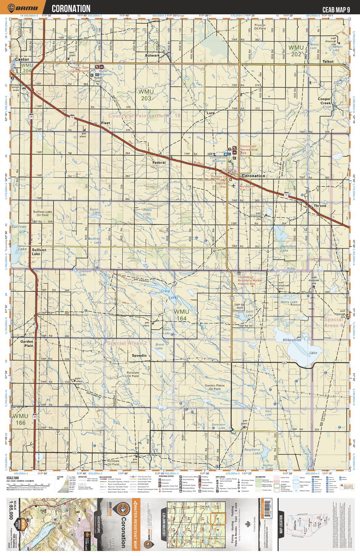 This recreation topographic map for Coronation highlights all the logging and resource roads, multi-use trails for hikers, mountain bikers, horseback riders, cross-country skiers and snowshoers, motorized trails for ATVers and snowmobiles, fishing lakes and rivers, recreation areas, campgrounds, day-use areas, viewpoints, backcountry campsites, work camps, oil & gas sites, backcountry huts and cabins and more. No other map for the area provides you with this level of recreational or topographic detail. Covering 3,040 km2 (1,175 mi2) in total, this 1:85,000 scale map measures 48 x 63.5 km (30 x 39.5 mi). Special features include enhanced oil & gas data plus countless roads, trails and recreational Points of Interest. This map includes Kirkpatrick Lake, Craig Lake, Sullivan Lake, Coronation, Throne, Fleet, Castor, Spondin, Copper Creek, Talbot and more!