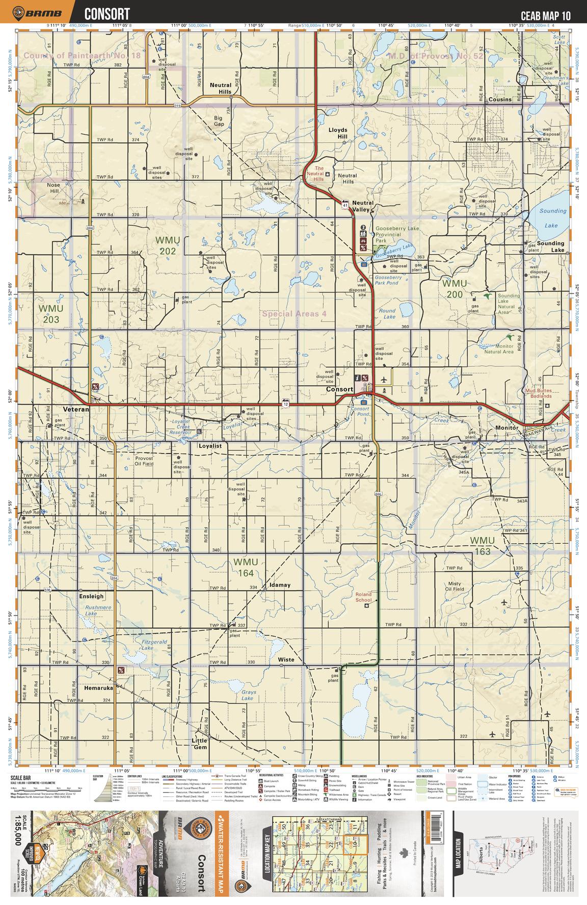 This recreation topographic map for Consort highlights all the logging and resource roads, multi-use trails for hikers, mountain bikers, horseback riders, cross-country skiers and snowshoers, motorized trails for ATVers and snowmobiles, fishing lakes and rivers, recreation areas, campgrounds, day-use areas, viewpoints, backcountry campsites, work camps, oil & gas sites, backcountry huts and cabins and more. No other map for the area provides you with this level of recreational or topographic detail. Covering 3,040 km2 (1,175 mi2) in total, this 1:85,000 scale map measures 48 x 63.5 km (30 x 39.5 mi). Special features include enhanced oil & gas data plus countless roads, trails and recreational Points of Interest. This map includes Consort, Gooseberry Lake, Sounding Lake, Veteran, Neutral Valley, Lloyd Hills, Cousins, Loyalist, Monitor, Wiste and more!