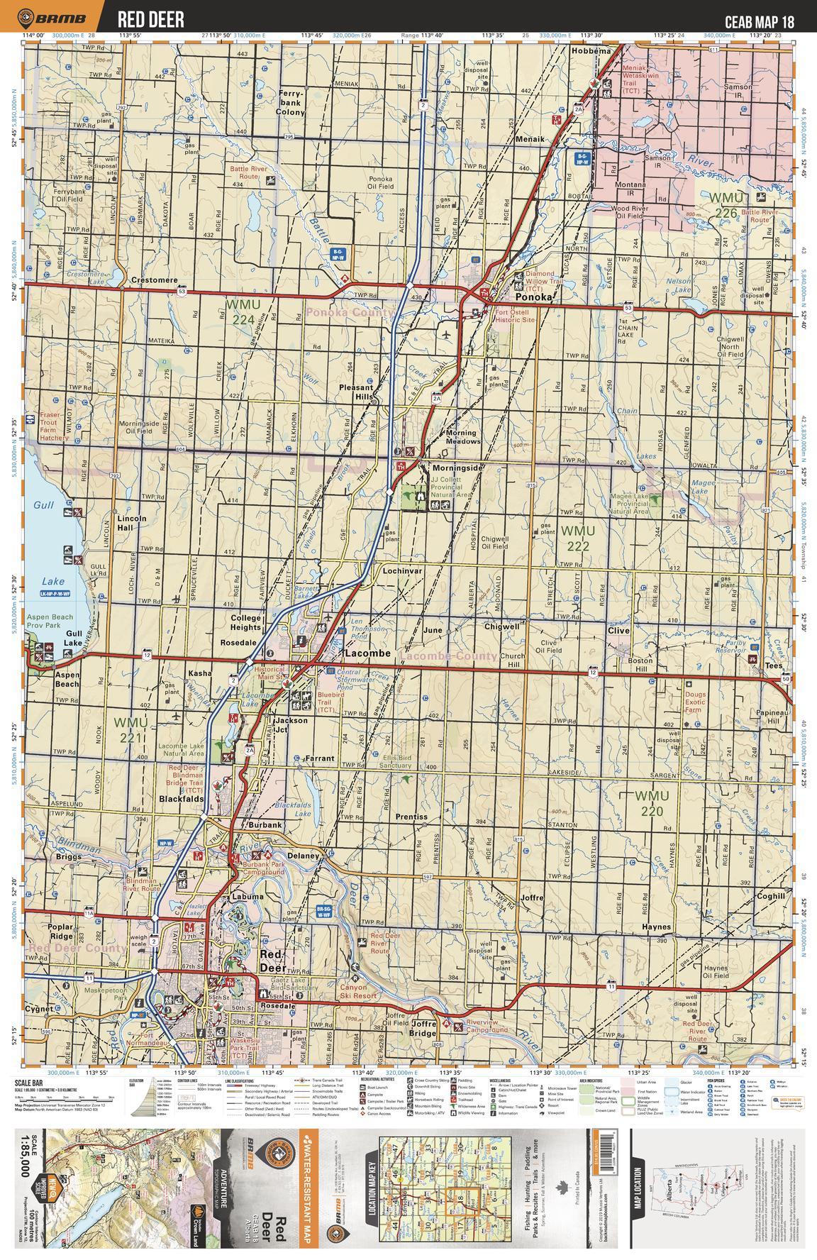 This recreation topographic map for Red Deer highlights all the logging and resource roads, multi-use trails for hikers, mountain bikers, horseback riders, cross-country skiers and snowshoers, motorized trails for ATVers and snowmobiles, fishing lakes and rivers, recreation areas, campgrounds, day-use areas, viewpoints, backcountry campsites, work camps, oil & gas sites, backcountry huts and cabins and more. No other map for the area provides you with this level of recreational or topographic detail. Covering 3,040 km2 (1,175 mi2) in total, this 1:85,000 scale map measures 48 x 63.5 km (30 x 39.5 mi). Special features include enhanced oil & gas data plus countless roads, trails and recreational Points of Interest. This map includes Gull Lake, Red Deer, Blackfalds, Lacombe, Morningside, Ponoka, Battle River, Red Deer River, Clive, Tees and more!