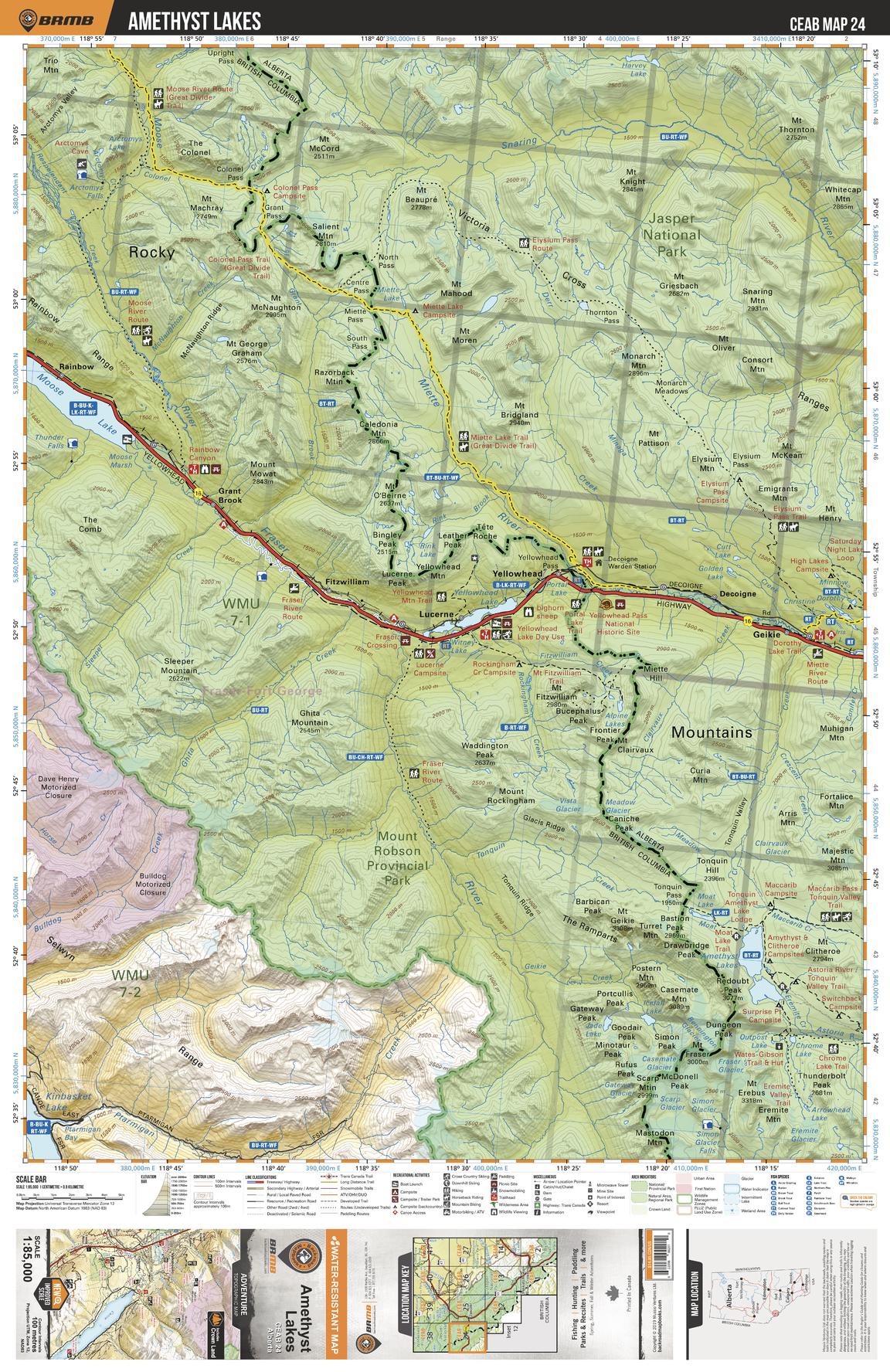 This recreation topographic map for Amethyst Lakes highlights all the logging and resource roads, multi-use trails for hikers, mountain bikers, horseback riders, cross-country skiers and snowshoers, motorized trails for ATVers and snowmobiles, fishing lakes and rivers, recreation areas, campgrounds, day-use areas, viewpoints, backcountry campsites, work camps, oil & gas sites, backcountry huts and cabins and more. No other map for the area provides you with this level of recreational or topographic detail. Covering 3,040 km2 (1,175 mi2) in total, this 1:85,000 scale map measures 48 x 63.5 km (30 x 39.5 mi). Special features include enhanced oil & gas data plus countless roads, trails and recreational Points of Interest. This map includes Amethyst Lakes, Mount Robson Provincial Park, Jasper National Park, Moose Lake, Kinbasket Lake, Yellowhead Lake, Snaring River and more!