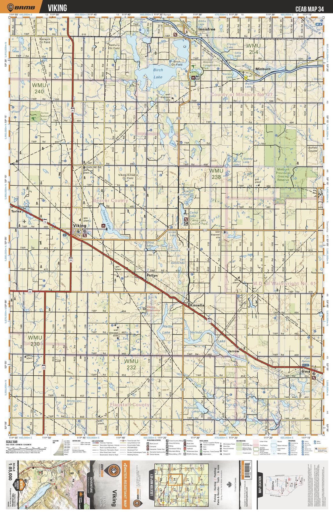 This recreation topographic map for Viking highlights all the logging and resource roads, multi-use trails for hikers, mountain bikers, horseback riders, cross-country skiers and snowshoers, motorized trails for ATVers and snowmobiles, fishing lakes and rivers, recreation areas, campgrounds, day-use areas, viewpoints, backcountry campsites, work camps, oil & gas sites, backcountry huts and cabins and more. No other map for the area provides you with this level of recreational or topographic detail. Covering 3,040 km2 (1,175 mi2) in total, this 1:85,000 scale map measures 48 x 63.5 km (30 x 39.5 mi). Special features include enhanced oil & gas data plus countless roads, trails and recreational Points of Interest. This map includes Vernon Lake, Kinsella, Viking, Birch Lake, Thomas Lake, Hattie Lake, Irma, Minburn, Alice Lake, Camp Lake and more!