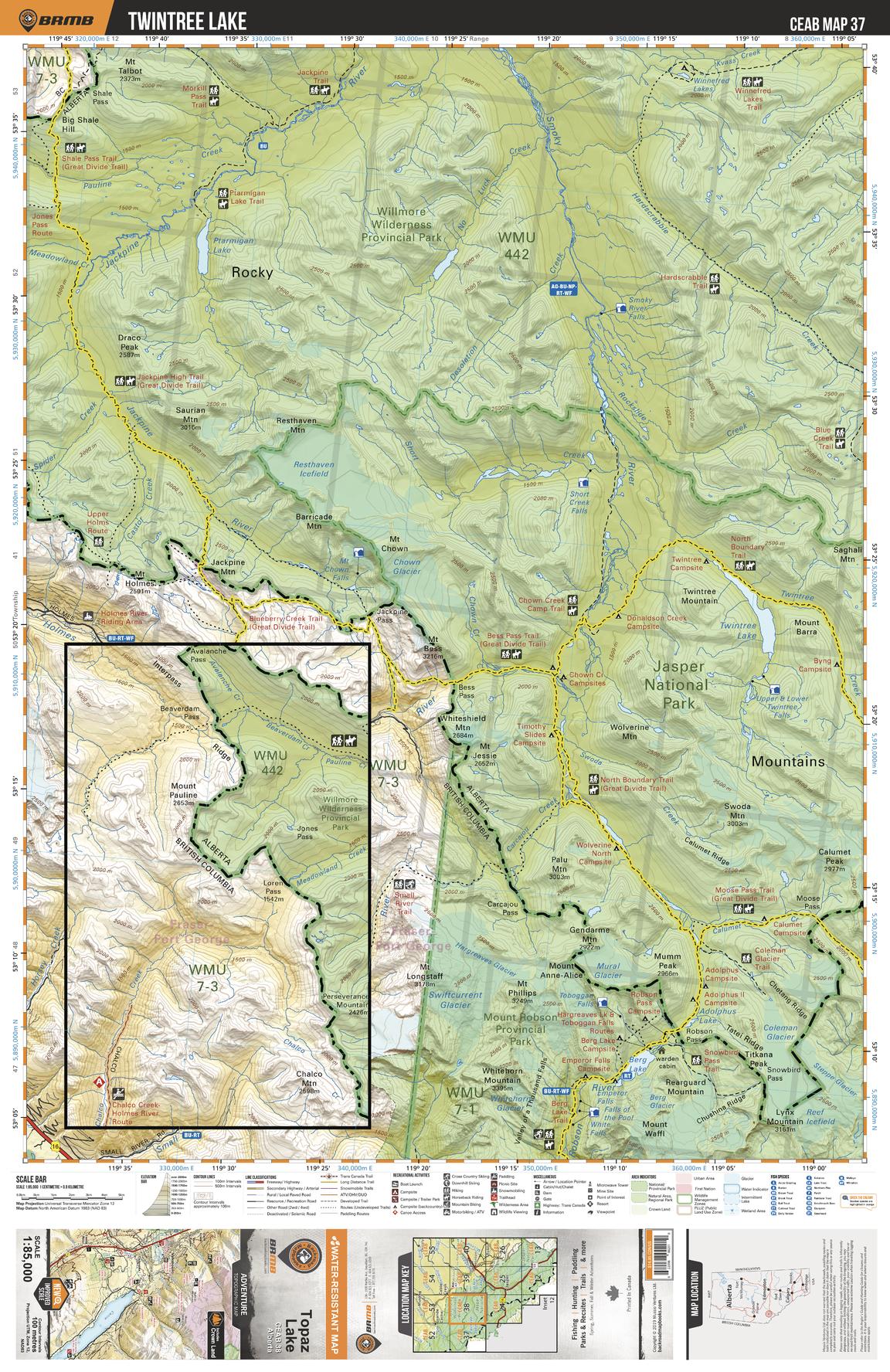 This recreation topographic map for Twintree Lake highlights all the logging and resource roads, multi-use trails for hikers, mountain bikers, horseback riders, cross-country skiers and snowshoers, motorized trails for ATVers and snowmobiles, fishing lakes and rivers, recreation areas, campgrounds, day-use areas, viewpoints, backcountry campsites, work camps, oil & gas sites, backcountry huts and cabins and more. No other map for the area provides you with this level of recreational or topographic detail. Covering 3,040 km2 (1,175 mi2) in total, this 1:85,000 scale map measures 48 x 63.5 km (30 x 39.5 mi). Special features include enhanced oil & gas data plus countless roads, trails and recreational Points of Interest. This map includes Twintree Lake, Smoky River, Jackpine River, Mount Robson Provincial Park, Berg Lake, Willmore Wilderness Provincial Park and more!