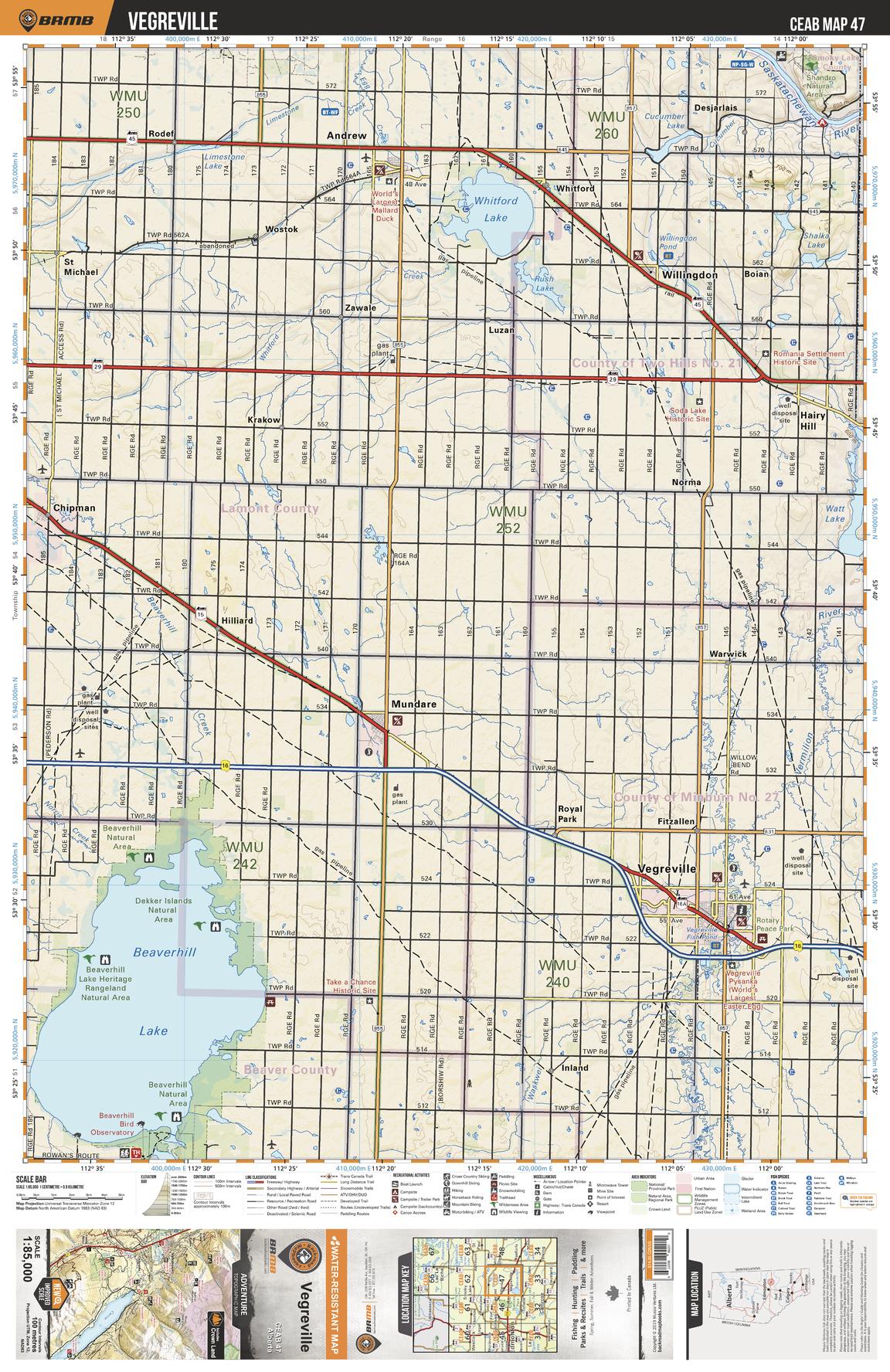 This recreation topographic map for Vegreville highlights all the logging and resource roads, multi-use trails for hikers, mountain bikers, horseback riders, cross-country skiers and snowshoers, motorized trails for ATVers and snowmobiles, fishing lakes and rivers, recreation areas, campgrounds, day-use areas, viewpoints, backcountry campsites, work camps, oil & gas sites, backcountry huts and cabins and more. No other map for the area provides you with this level of recreational or topographic detail. Covering 3,040 km2 (1,175 mi2) in total, this 1:85,000 scale map measures 48 x 63.5 km (30 x 39.5 mi). Special features include enhanced oil & gas data plus countless roads, trails and recreational Points of Interest. This map includes Beaverhill Lake, Begreville, Mundare, Whitford Lake, Andrew, Willlingdon, Watt Lake, Hairy Hill, Whitford, Chipman and more!