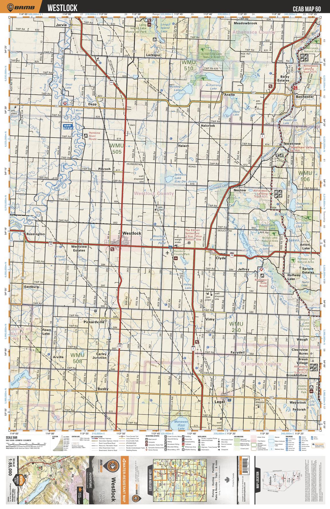 This recreation topographic map for Westlock highlights all the logging and resource roads, multi-use trails for hikers, mountain bikers, horseback riders, cross-country skiers and snowshoers, motorized trails for ATVers and snowmobiles, fishing lakes and rivers, recreation areas, campgrounds, day-use areas, viewpoints, backcountry campsites, work camps, oil & gas sites, backcountry huts and cabins and more. No other map for the area provides you with this level of recreational or topographic detail. Covering 3,040 km2 (1,175 mi2) in total, this 1:85,000 scale map measures 48 x 63.5 km (30 x 39.5 mi). Special features include enhanced oil & gas data plus countless roads, trails and recreational Points of Interest. This map includes Pembina River, Westlock, Clyde, Rochester, Halfway Lake, Wakomao Lake, Bridge River, Lebeaus Lake, Armstrong Lake, Rossington and more!