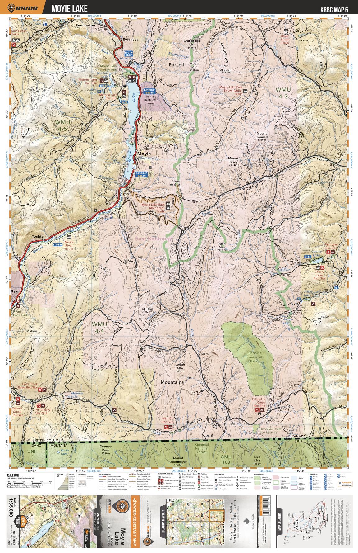 This recreation topographic map for the Moyie Lake area highlights all the logging and resource roads, multi-use trails for hikers, mountain bikers, horseback riders, cross-country skiers and snowshoers, motorized trails for ATVers and snowmobiles, fishing lakes and rivers, recreation areas, campgrounds, day-use areas, viewpoints, backcountry campsites, backcountry huts and cabins and more. No other map for the area provides you with this level of recreational or topographic detail. Special features include private land, labelled fish species and countless roads, trails and recreational Points of Interest. Covering 1,950 km2 (753 mi2), this 1:65,000 scale map measures 38 x 51 km (23.5 x 32 mi). This map includes Moyie Lake, Gilnockie Prov Park, Moyie River, Cherry Lake, Swansea, Moyie, Yahk Range, Tochty, Ryan, Gilnockie Creek and more!