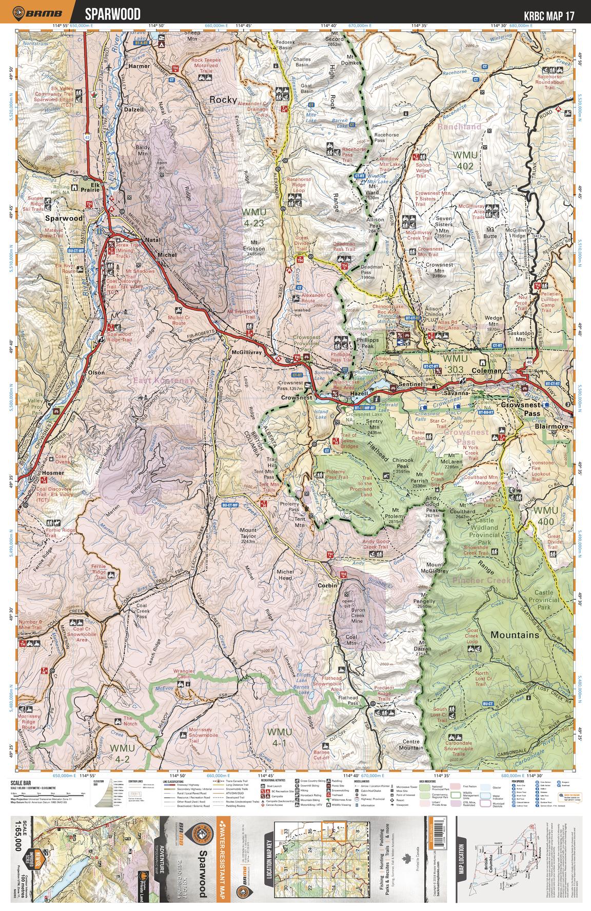 This recreation topographic map for the Sparwood area highlights all the logging and resource roads, multi-use trails for hikers, mountain bikers, horseback riders, cross-country skiers and snowshoers, motorized trails for ATVers and snowmobiles, fishing lakes and rivers, recreation areas, campgrounds, day-use areas, viewpoints, backcountry campsites, backcountry huts and cabins and more. No other map for the area provides you with this level of recreational or topographic detail. Special features include private land, labelled fish species and countless roads, trails and recreational Points of Interest. Covering 1,950 km2 (753 mi2), this 1:65,000 scale map measures 38 x 51 km (23.5 x 32 mi). This map includes Crowsnest Pass, Sparwood, Corbin, Harmer, Coleman, Crowsnest Lake, Crowsnest Prov Park, Blairmore, Hazell, Elk Valley Prov Park and more!