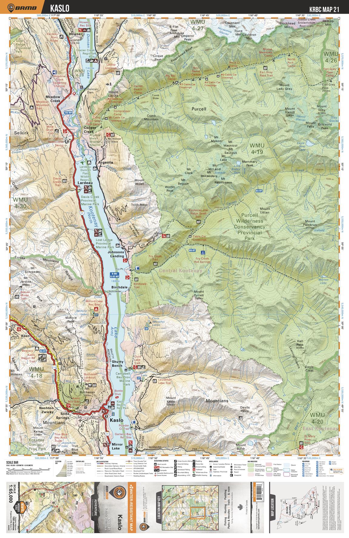 This recreation topographic map for the Kaslo area highlights all the logging and resource roads, multi-use trails for hikers, mountain bikers, horseback riders, cross-country skiers and snowshoers, motorized trails for ATVers and snowmobiles, fishing lakes and rivers, recreation areas, campgrounds, day-use areas, viewpoints, backcountry campsites, backcountry huts and cabins and more. No other map for the area provides you with this level of recreational or topographic detail. Special features include private land, labelled fish species and countless roads, trails and recreational Points of Interest. Covering 1,950 km2 (753 mi2), this 1:65,000 scale map measures 38 x 51 km (23.5 x 32 mi). This map includes Purcell Wilderness Conservancy Prov Park, Kootenay Lake, Kaslo, Birchdale, Lardeau, Howser, Duncan Lake, Meadow Creek, Johnsons Landing, Shutty Lake and more!