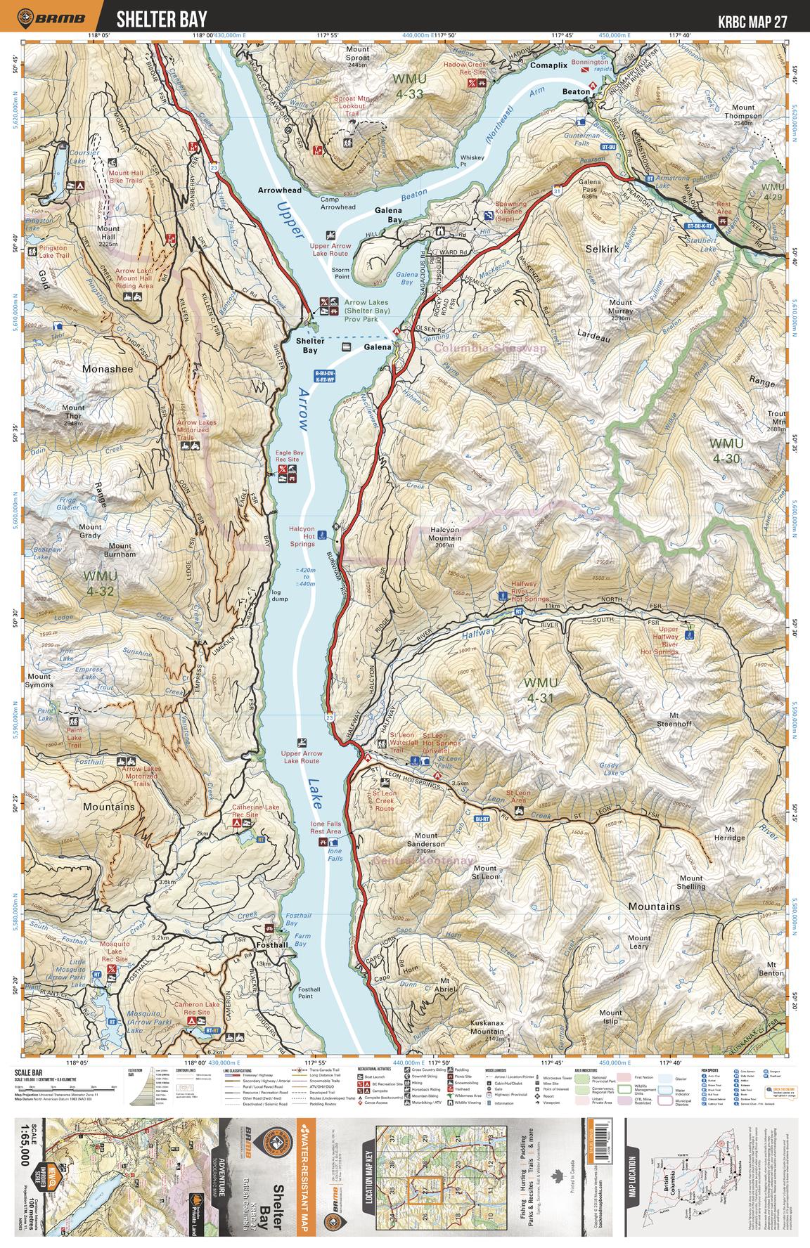 This recreation topographic map for the Shelter Bay area highlights all the logging and resource roads, multi-use trails for hikers, mountain bikers, horseback riders, cross-country skiers and snowshoers, motorized trails for ATVers and snowmobiles, fishing lakes and rivers, recreation areas, campgrounds, day-use areas, viewpoints, backcountry campsites, backcountry huts and cabins and more. No other map for the area provides you with this level of recreational or topographic detail. Special features include private land, labelled fish species and countless roads, trails and recreational Points of Interest. Covering 1,950 km2 (753 mi2), this 1:65,000 scale map measures 38 x 51 km (23.5 x 32 mi). This map includes Upper Arrow Lake, Fosthall, Arrowhead, Shelter Bay, Mosquito Lake, Staubert Lake, Coursier Lake, Beaton Arm, Galena, Comaplix and more!