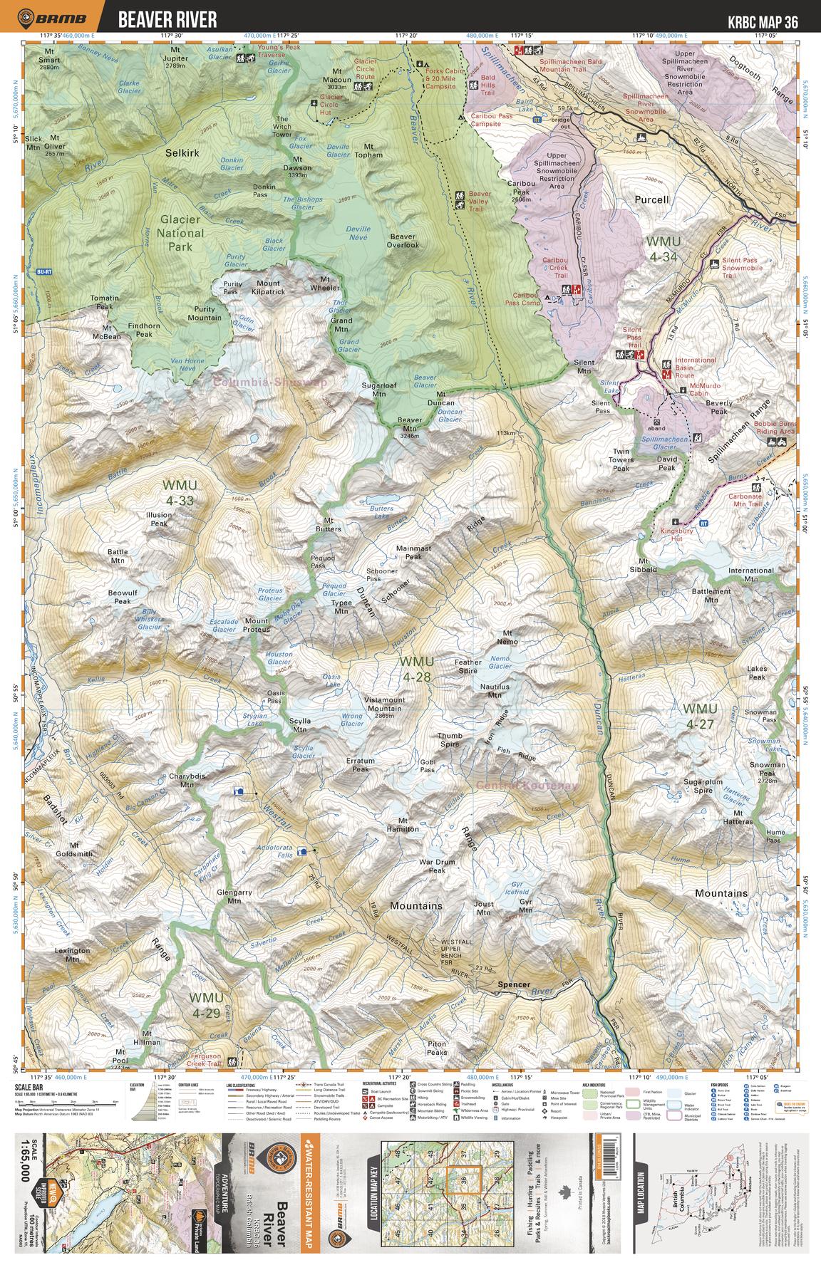 This recreation topographic map for the Beaver River area highlights all the logging and resource roads, multi-use trails for hikers, mountain bikers, horseback riders, cross-country skiers and snowshoers, motorized trails for ATVers and snowmobiles, fishing lakes and rivers, recreation areas, campgrounds, day-use areas, viewpoints, backcountry campsites, backcountry huts and cabins and more. No other map for the area provides you with this level of recreational or topographic detail. Special features include private land, labelled fish species and countless roads, trails and recreational Points of Interest. Covering 1,950 km2 (753 mi2), this 1:65,000 scale map measures 38 x 51 km (23.5 x 32 mi). This map includes Glacier National Park, Duncan River, Spillimacheen River, Silent Mtn, Beaver River, Bobbie Burns Creek, McMurdo Creek and more!