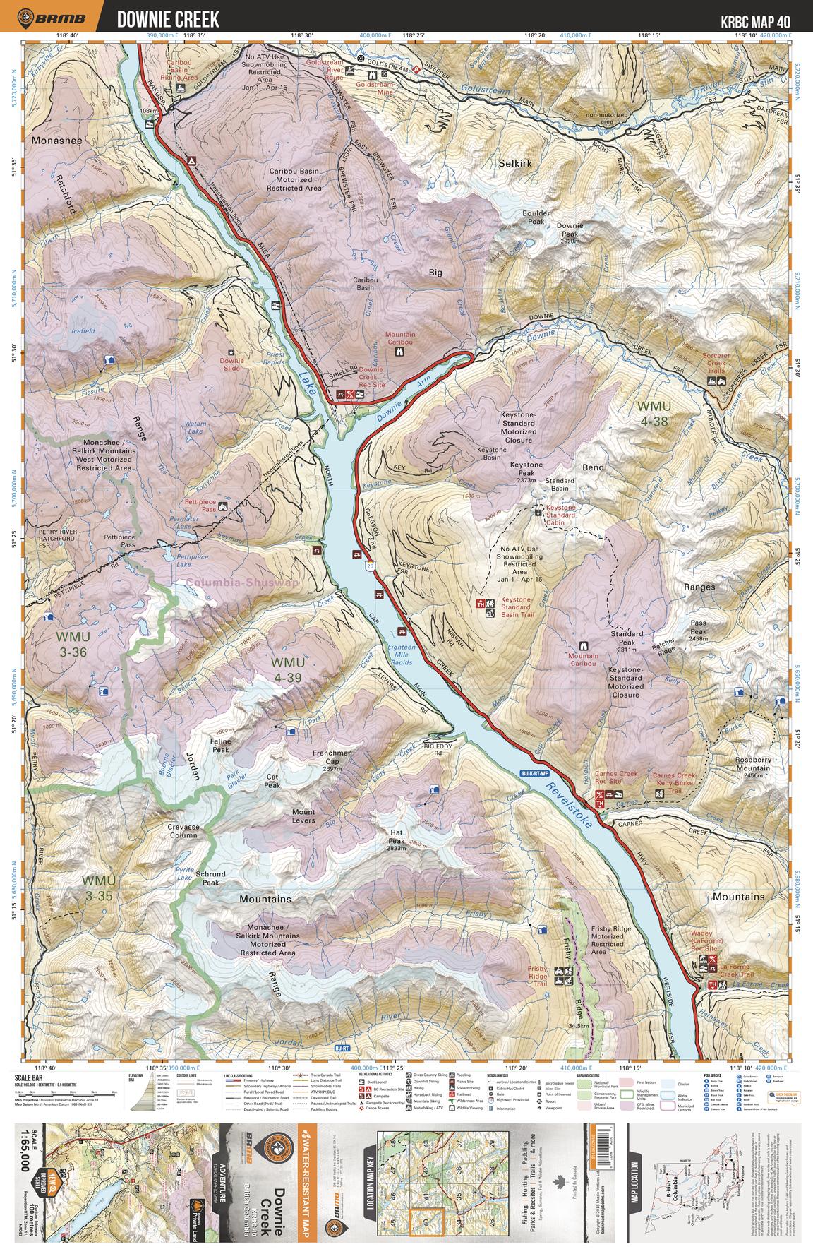 This recreation topographic map for the Downie Creek area highlights all the logging and resource roads, multi-use trails for hikers, mountain bikers, horseback riders, cross-country skiers and snowshoers, motorized trails for ATVers and snowmobiles, fishing lakes and rivers, recreation areas, campgrounds, day-use areas, viewpoints, backcountry campsites, backcountry huts and cabins and more. No other map for the area provides you with this level of recreational or topographic detail. Special features include private land, labelled fish species and countless roads, trails and recreational Points of Interest. Covering 1,950 km2 (753 mi2), this 1:65,000 scale map measures 38 x 51 km (23.5 x 32 mi). This map includes Lake Revelstoke, Downie Arm, Goldstream River, Downie Creek, Keystone Peak, Carnes Creek and more!