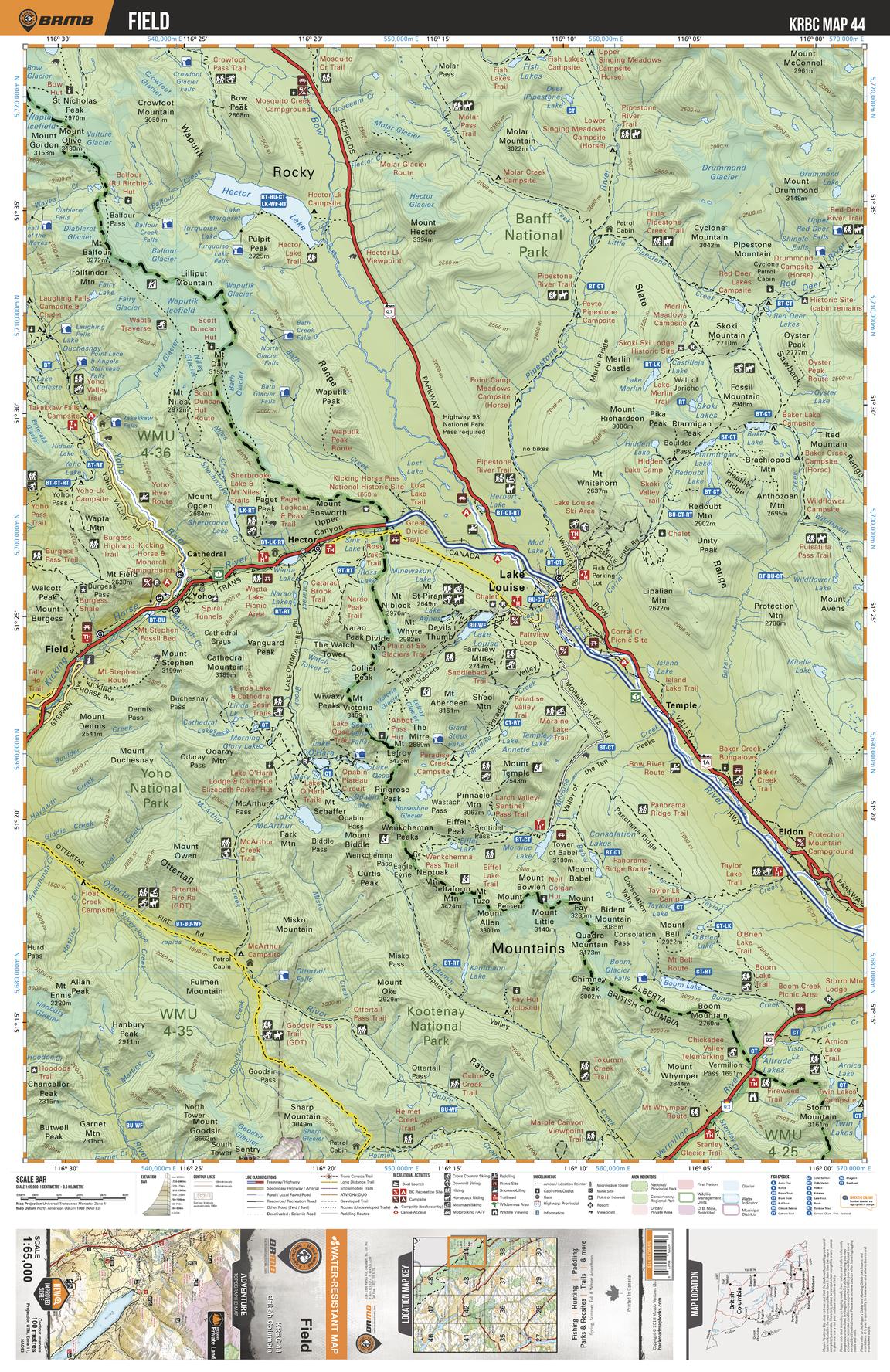 This recreation topographic map for the Field area highlights all the logging and resource roads, multi-use trails for hikers, mountain bikers, horseback riders, cross-country skiers and snowshoers, motorized trails for ATVers and snowmobiles, fishing lakes and rivers, recreation areas, campgrounds, day-use areas, viewpoints, backcountry campsites, backcountry huts and cabins and more. No other map for the area provides you with this level of recreational or topographic detail. Special features include private land, labelled fish species and countless roads, trails and recreational Points of Interest. Covering 1,950 km2 (753 mi2), this 1:65,000 scale map measures 38 x 51 km (23.5 x 32 mi). This map includes Banff National Park, Yoho National Park, Hector Lake, Lake Louise, Bow River, Field, Kicking Horse River, Kootenay National Park, Lake McArthur, Boom Lake and more!