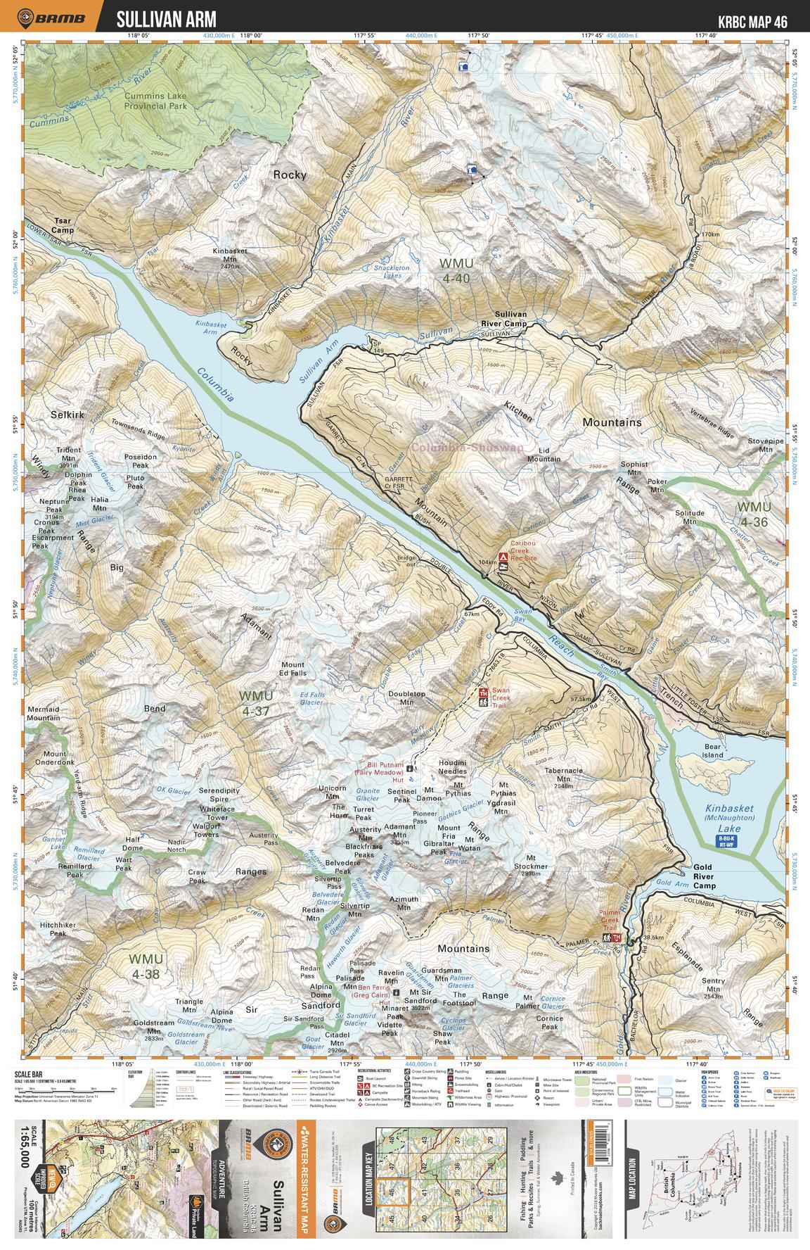 This recreation topographic map for the Sullivan Arm area highlights all the logging and resource roads, multi-use trails for hikers, mountain bikers, horseback riders, cross-country skiers and snowshoers, motorized trails for ATVers and snowmobiles, fishing lakes and rivers, recreation areas, campgrounds, day-use areas, viewpoints, backcountry campsites, backcountry huts and cabins and more. No other map for the area provides you with this level of recreational or topographic detail. Special features include private land, labelled fish species and countless roads, trails and recreational Points of Interest. Covering 1,950 km2 (753 mi2), this 1:65,000 scale map measures 38 x 51 km (23.5 x 32 mi). This map includes Kinbasket (McNaughton) Lake, Columbia Reach, Sullivan Arm, Sullivan River Camp, Sullivan River, Cummins Lake Prov Park, Fairy Meadow, Gold River Camp, Tsar Camp, Kinbasket River and more!
