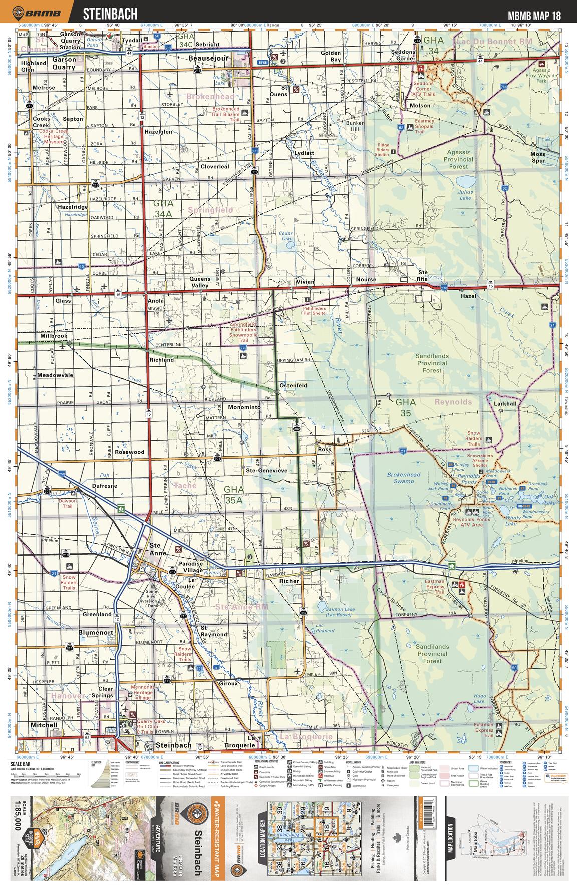 This recreation topographic map for Steinbach highlights all the logging/resource roads, hunting areas, fishing lakes & streams, campsites, paddling routes for canoeing and kayaking, wildlife viewing areas, multi-use trails for hiking, biking, horseback riding, cross-country skiing and snowshoeing, motorized trails for ATVing and snowmobiling & more. Covering 3,040 km2 (1,175 mi2), this 1:85,000 scale map measures 50 x 63.5 km (30 x 39.5 mi), providing you with more topographic and recreational detail for the Melita area than any other map on the market. New features include Crown land areas and labeled fish species, plus countless new trails, roads and recreational Points of Interest. Included in this map are Agassiz Prov Forest, Sandilands Prov Forest, Brokenhead Swamp, Reynolds Ponds, Blumenort, Steinbach, Beausejour, Garson Quarry, Brokenhead River, Ste Anne and more.