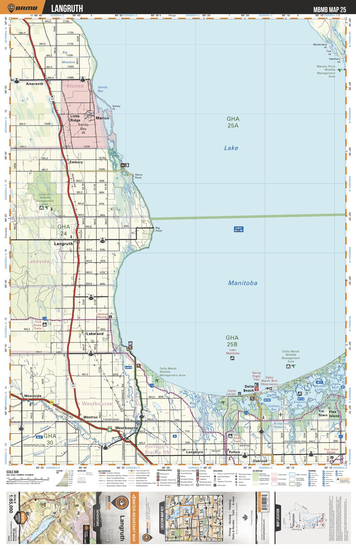 This recreation topographic map for Langruth highlights all the logging/resource roads, hunting areas, fishing lakes & streams, campsites, paddling routes for canoeing and kayaking, wildlife viewing areas, multi-use trails for hiking, biking, horseback riding, cross-country skiing and snowshoeing, motorized trails for ATVing and snowmobiling & more. Covering 3,040 km2 (1,175 mi2), this 1:85,000 scale map measures 50 x 63.5 km (30 x 39.5 mi), providing you with more topographic and recreational detail for the Melita area than any other map on the market. New features include Crown land areas and labeled fish species, plus countless new trails, roads and recreational Points of Interest. Included in this map are Lake Manitoba, Langruth, Westbourne, Delta Beach, Whitemud River, Delta Marsh, Marius, Little Ridge, Lakeland, Simpson Bay and more.