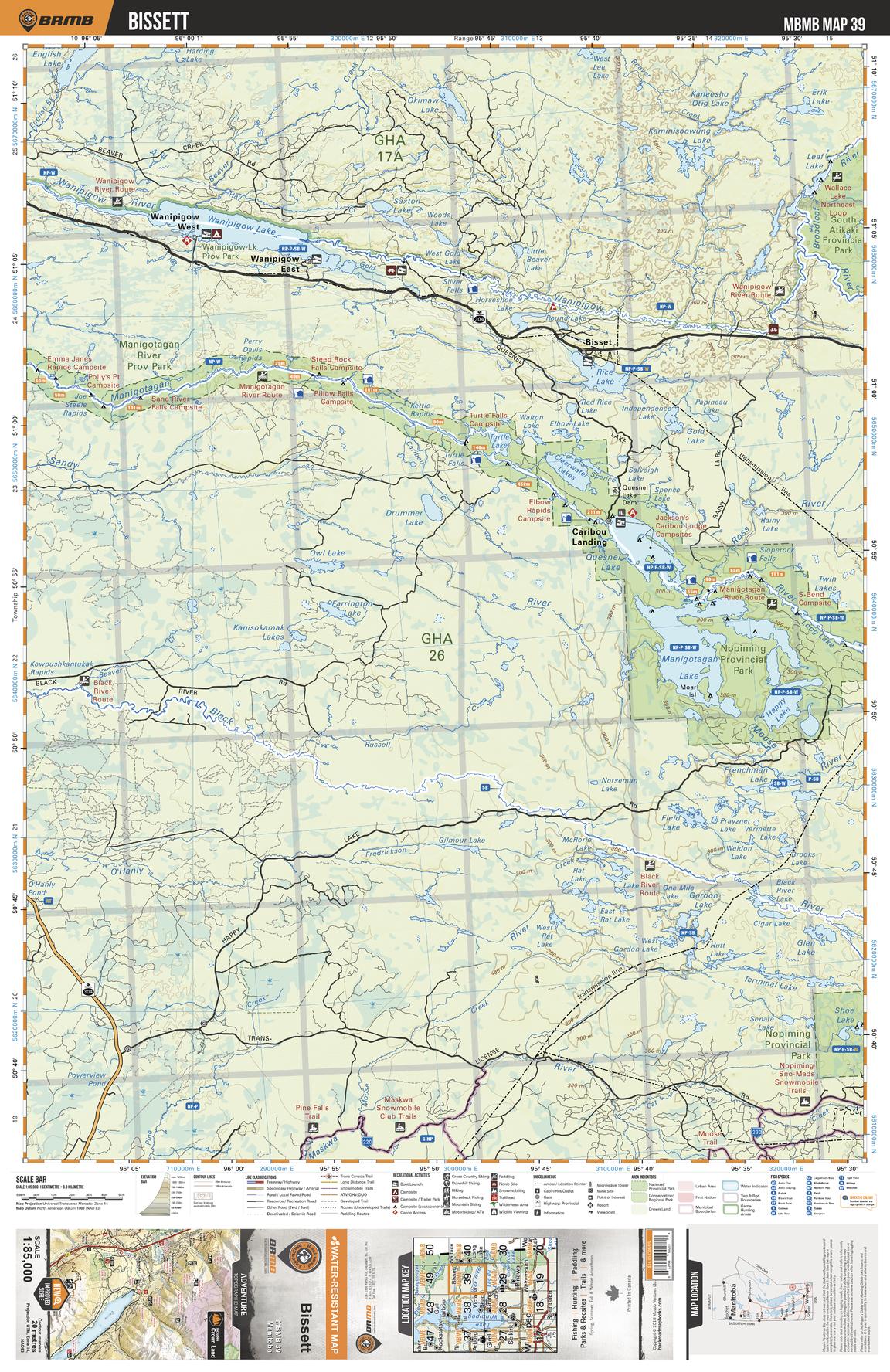 This recreation topographic map for Bissett highlights all the logging/resource roads, hunting areas, fishing lakes & streams, campsites, paddling routes for canoeing and kayaking, wildlife viewing areas, multi-use trails for hiking, biking, horseback riding, cross-country skiing and snowshoeing, motorized trails for ATVing and snowmobiling & more. Covering 3,040 km2 (1,175 mi2), this 1:85,000 scale map measures 50 x 63.5 km (30 x 39.5 mi), providing you with more topographic and recreational detail for the Melita area than any other map on the market. New features include Crown land areas and labeled fish species, plus countless new trails, roads and recreational Points of Interest. Included in this map are Nopoming Prov Park, Manigotagan River, Manigotagan Lake, Quesnel Lake, Clearwater Lakes, Turtle Lake, Wanipigow Lake, Rice Lake, Black River, Shoe Lake and more.