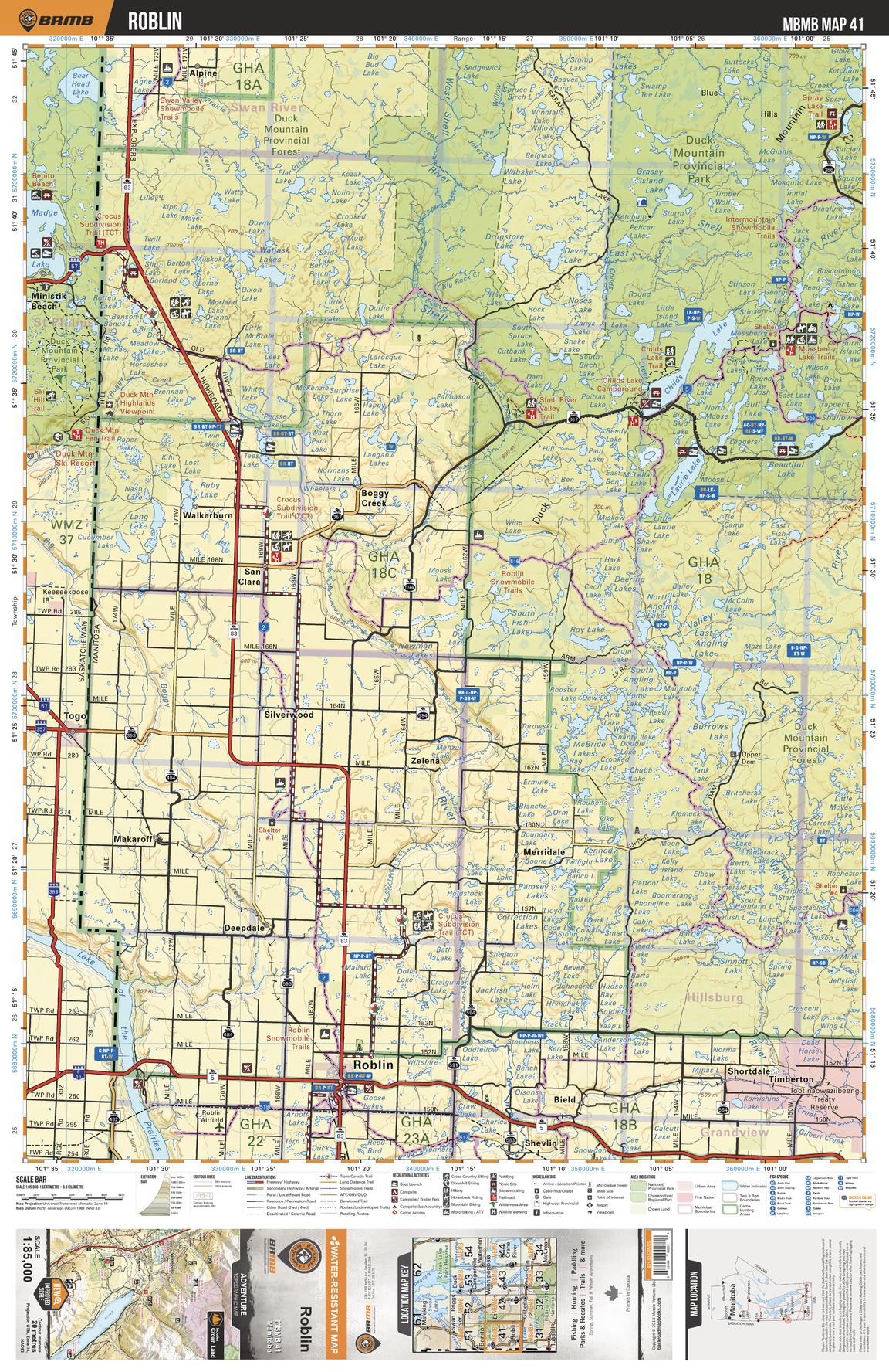 This recreation topographic map for Roblin highlights all the logging/resource roads, hunting areas, fishing lakes & streams, campsites, paddling routes for canoeing and kayaking, wildlife viewing areas, multi-use trails for hiking, biking, horseback riding, cross-country skiing and snowshoeing, motorized trails for ATVing and snowmobiling & more. Covering 3,040 km2 (1,175 mi2), this 1:85,000 scale map measures 50 x 63.5 km (30 x 39.5 mi), providing you with more topographic and recreational detail for the Melita area than any other map on the market. New features include Crown land areas and labeled fish species, plus countless new trails, roads and recreational Points of Interest. Included in this map are Duck Mountain Prov Park, Roblin, Lake of the Prairies, Childs Lake, San Clara, Shell River, Laurie Lake, Mossberry Lake, Spray Lake, Boggy Creek and more.