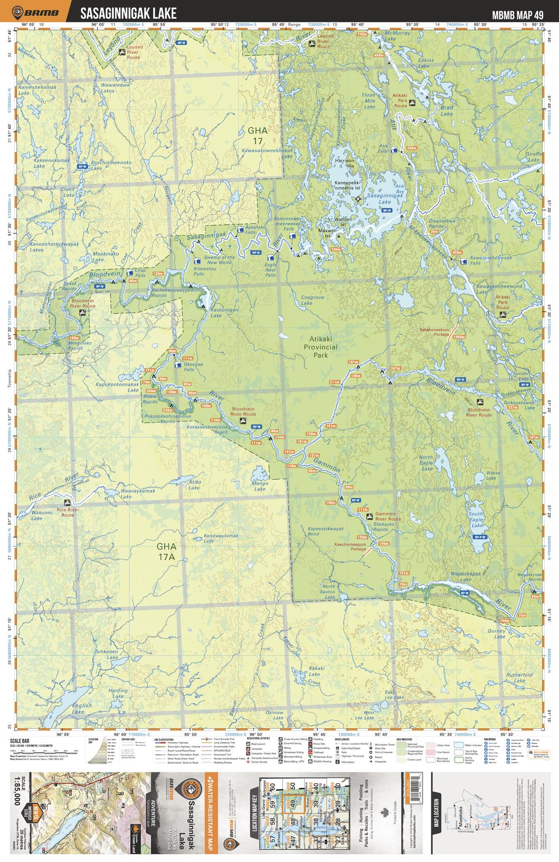This recreation topographic map for Sasaginnigak Lake highlights all the logging/resource roads, hunting areas, fishing lakes & streams, campsites, paddling routes for canoeing and kayaking, wildlife viewing areas, multi-use trails for hiking, biking, horseback riding, cross-country skiing and snowshoeing, motorized trails for ATVing and snowmobiling & more. Covering 3,040 km2 (1,175 mi2), this 1:85,000 scale map measures 50 x 63.5 km (30 x 39.5 mi), providing you with more topographic and recreational detail for the Melita area than any other map on the market. New features include Crown land areas and labeled fish species, plus countless new trails, roads and recreational Points of Interest. Included in this map are Sasaginnigak Lake, Bloodvein River, Gammon River, English Lake, Atikaki Provincial Park ,Rice River, Kautunigan Lake and more.
