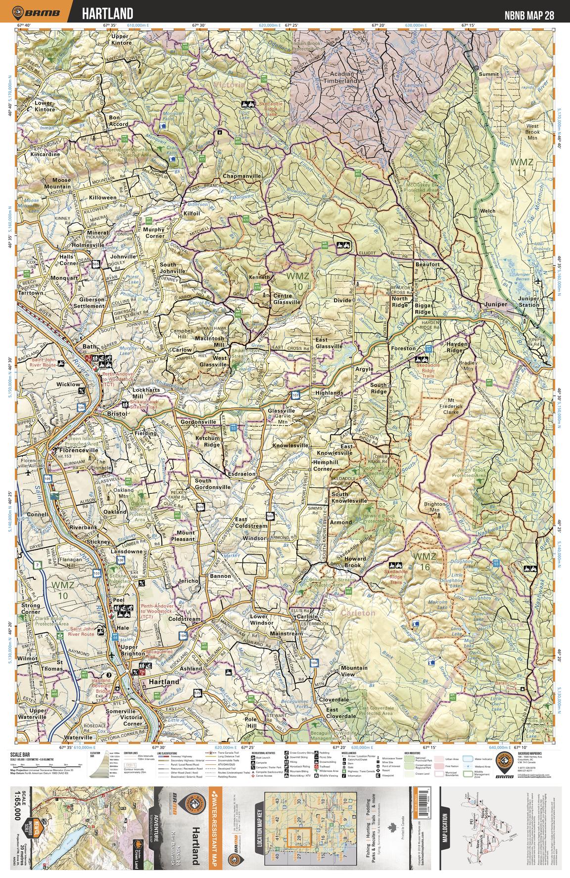 This recreation topographic map for Hartland highlights all the logging/resource roads, hunting areas, fishing lakes & streams, campsites, paddling routes for canoeing and kayaking, wildlife viewing areas, multi-use trails for hiking, biking, horseback riding, cross-country skiing and snowshoeing, motorized trails for ATVing and snowmobiling & more. Covering 1,950 km2 (750 mi2), this 1:65,000 scale map measures 38 x 51 km (23.5 x 32 mi), providing you with more topographic and recreational detail for the Grand Manan Island area than any other map on the market. New features include enhanced Crown land data and countless updates to roads, trails and recreational Points of Interest. This map includes Hartland, Florenceville, Wicklow, Juniper, Knowlesville, Saint John River, Nashwaak River, Bristol, Bath, Stickney and more!