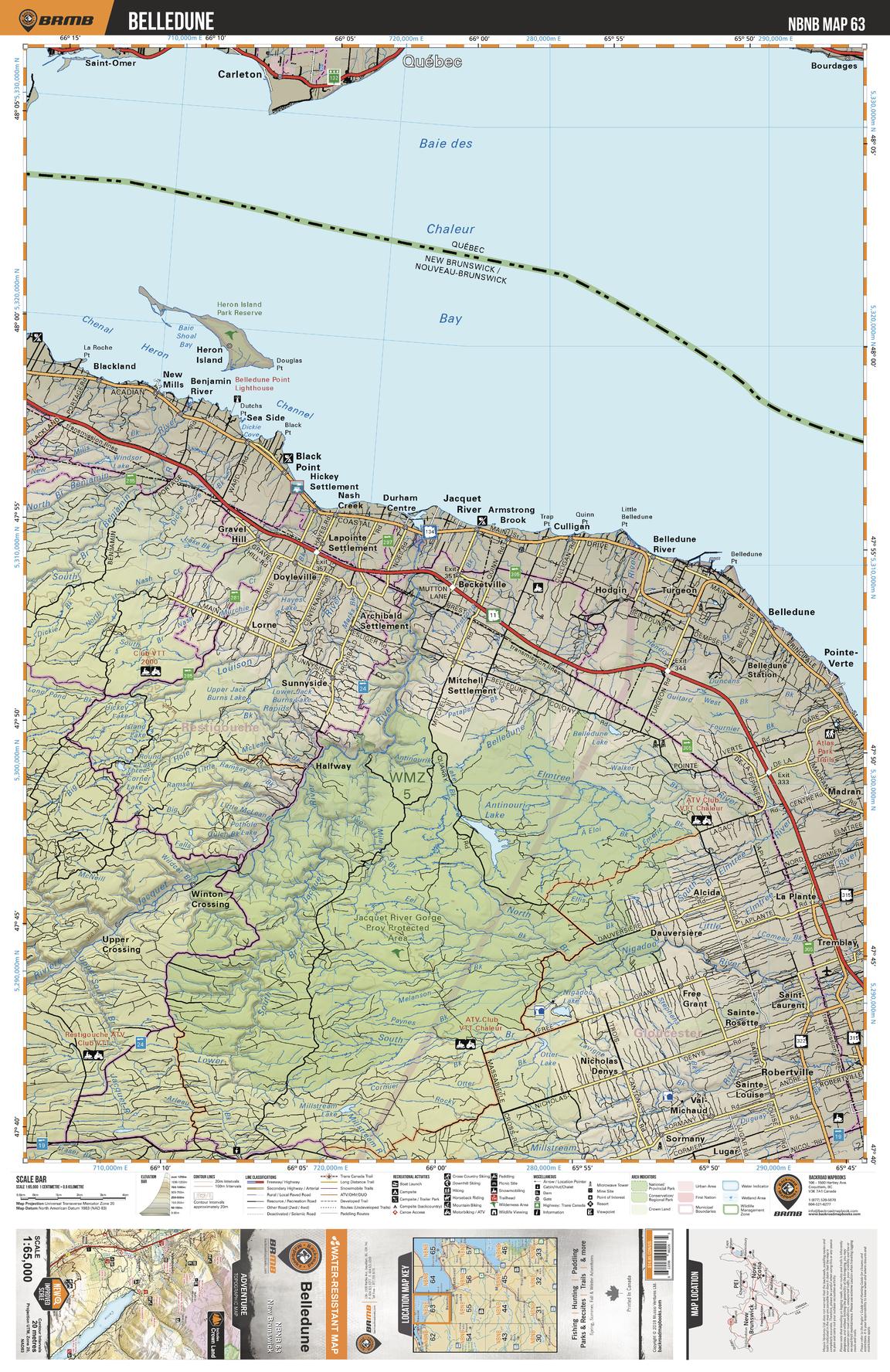 This recreation topographic map for Belledune highlights all the logging/resource roads, hunting areas, fishing lakes & streams, campsites, paddling routes for canoeing and kayaking, wildlife viewing areas, multi-use trails for hiking, biking, horseback riding, cross-country skiing and snowshoeing, motorized trails for ATVing and snowmobiling & more. Covering 1,950 km2 (750 mi2), this 1:65,000 scale map measures 38 x 51 km (23.5 x 32 mi), providing you with more topographic and recreational detail for the Grand Manan Island area than any other map on the market. New features include enhanced Crown land data and countless updates to roads, trails and recreational Points of Interest. This map includes Chaleur Bay, Belledune, Jacquet River Gorge Prov Protected Area, Antinouri Lake, Sunnyside, Jacquet River, Black Point, Heron Channel, Heron Island Park Reserve, Robertville and more!