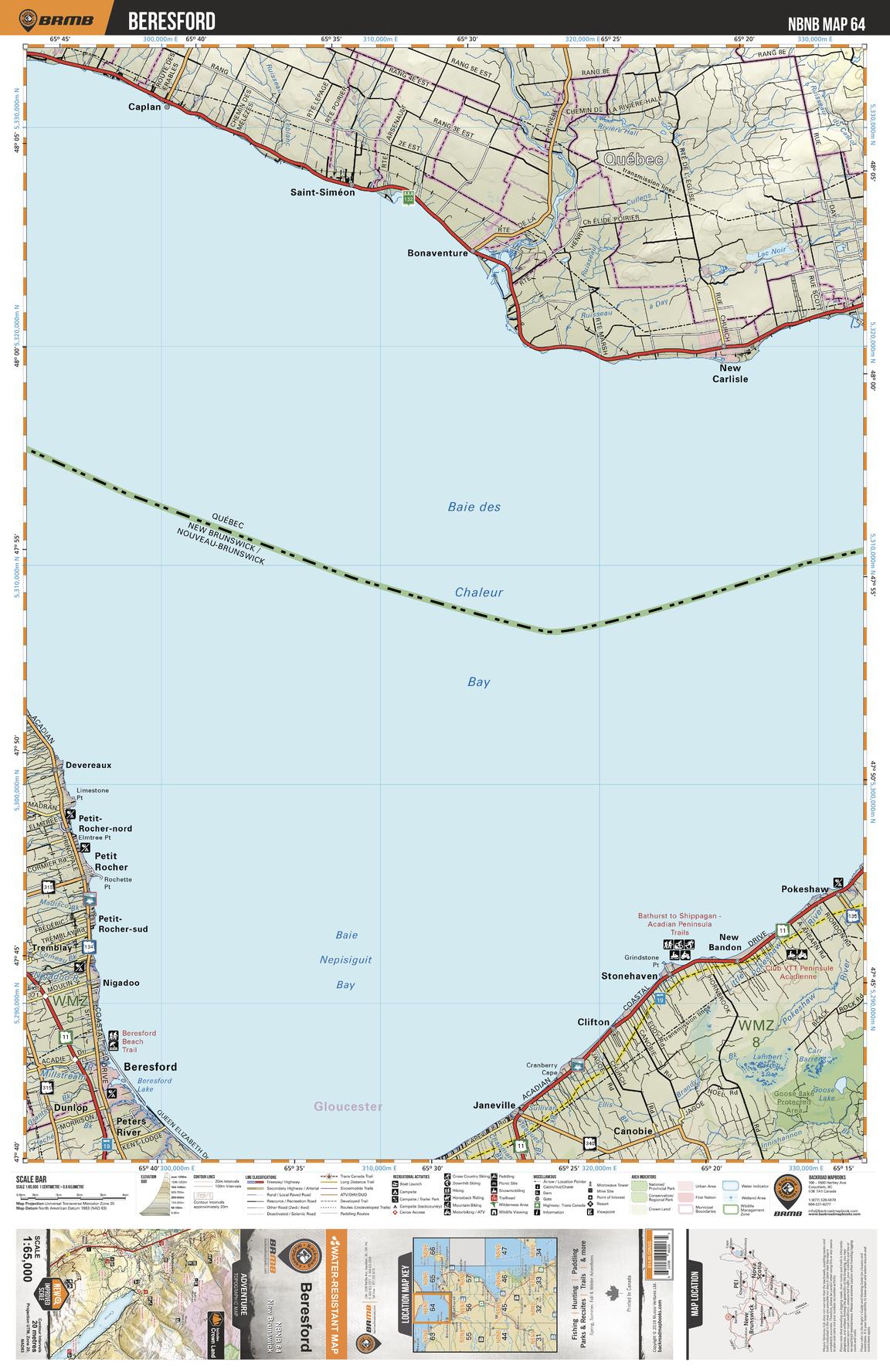 This recreation topographic map for Beresford highlights all the logging/resource roads, hunting areas, fishing lakes & streams, campsites, paddling routes for canoeing and kayaking, wildlife viewing areas, multi-use trails for hiking, biking, horseback riding, cross-country skiing and snowshoeing, motorized trails for ATVing and snowmobiling & more. Covering 1,950 km2 (750 mi2), this 1:65,000 scale map measures 38 x 51 km (23.5 x 32 mi), providing you with more topographic and recreational detail for the Grand Manan Island area than any other map on the market. New features include enhanced Crown land data and countless updates to roads, trails and recreational Points of Interest. This map includes Beresford, Nepisiguit Bay, Chaleur Bay, Pokeshaw, Clifton, Petit Rocher, Dunlop, Peters River, Stonehaven, Janeville and more!