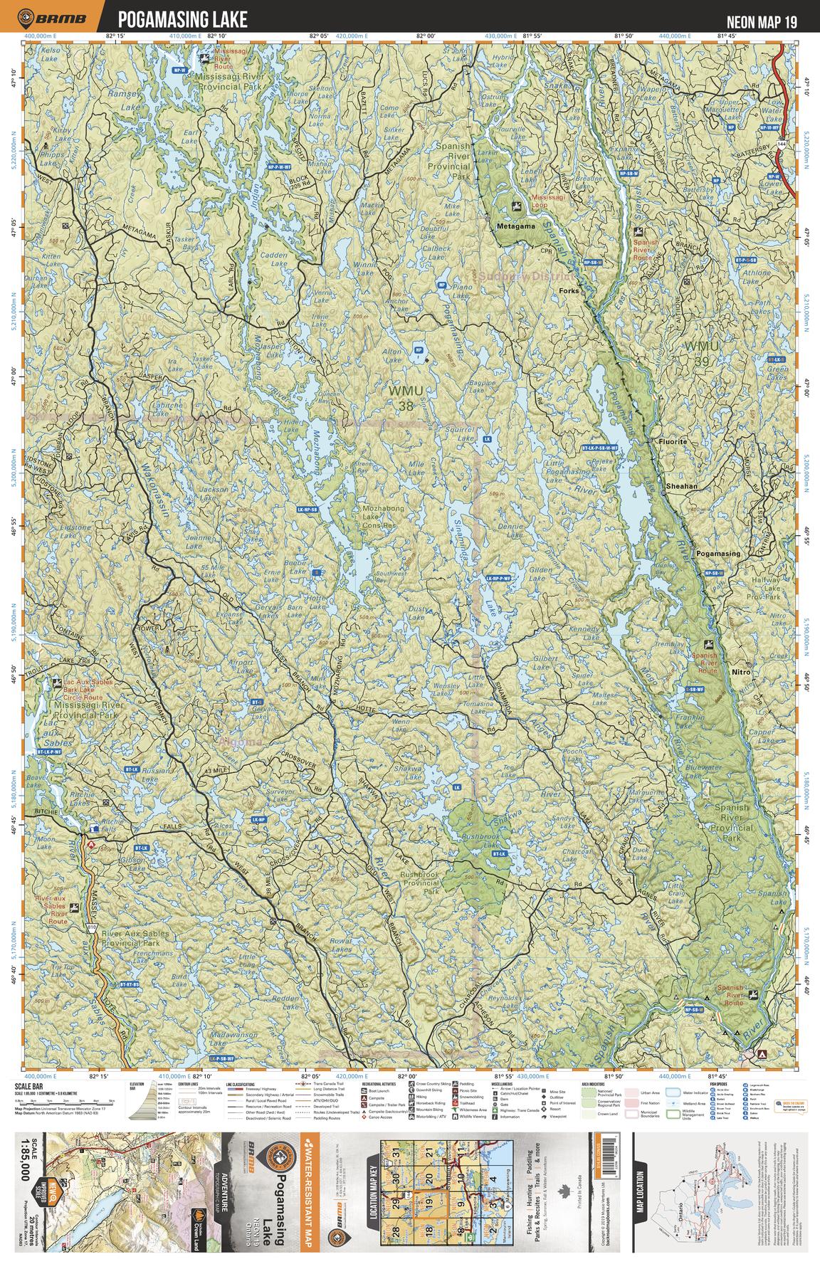 This recreation topographic map for Pogamasing Lake highlights all the logging/resource roads, hunting areas, fishing lakes & streams, campsites, paddling routes for canoeing and kayaking, wildlife viewing areas, multi-use trails for hiking, biking, horseback riding, cross-country skiing and snowshoeing, motorized trails for ATVing and snowmobiling & more. Covering 3,040 km2 (1,170 mi2), this 1:85,000 scale map measures 48 x 63.5 km (30 x 39.5 mi), providing you with more topographic and recreational detail for the Meldrum Bay area than any other map on the market. New features include Crown land areas, countless new roads and trails plus additional recreational Points of Interest. Included on this map are Spanish River, Spanish River Prov Park, Mississagi River Prov Park, Mozhabong Lake, Sinamida Lake, Indian Lake, Ramsey Lake, Metagama, Pogamasing Lake and more!