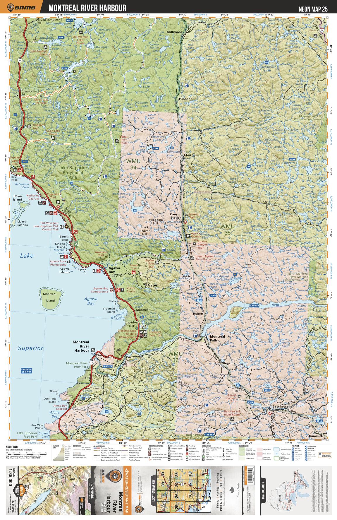 This recreation topographic map for Montreal River Harbour highlights all the logging/resource roads, hunting areas, fishing lakes & streams, campsites, paddling routes for canoeing and kayaking, wildlife viewing areas, multi-use trails for hiking, biking, horseback riding, cross-country skiing and snowshoeing, motorized trails for ATVing and snowmobiling & more. Covering 3,040 km2 (1,170 mi2), this 1:85,000 scale map measures 48 x 63.5 km (30 x 39.5 mi), providing you with more topographic and recreational detail for the Meldrum Bay area than any other map on the market. New features include Crown land areas, countless new roads and trails plus additional recreational Points of Interest. Included on this map are Montreal River, Lake Superior, Agawa Bay, Montreal River Harbour, Lake Superior Prov Park, Batchewana River, Agawa River, Sand River, Baldhead River, Montreal River Prov Park and more!