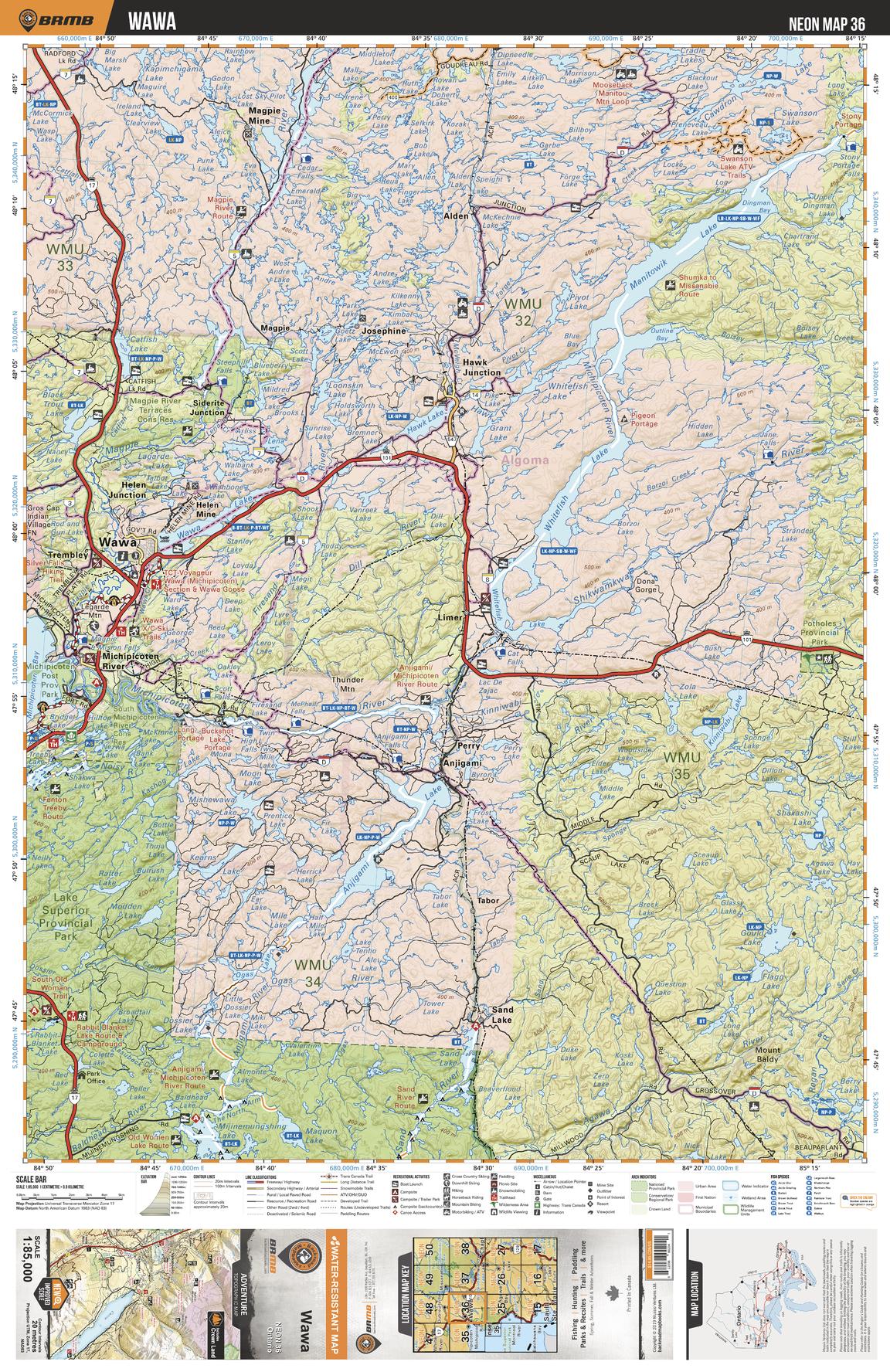 This recreation topographic map for Wawa highlights all the logging/resource roads, hunting areas, fishing lakes & streams, campsites, paddling routes for canoeing and kayaking, wildlife viewing areas, multi-use trails for hiking, biking, horseback riding, cross-country skiing and snowshoeing, motorized trails for ATVing and snowmobiling & more. Covering 3,040 km2 (1,170 mi2), this 1:85,000 scale map measures 48 x 63.5 km (30 x 39.5 mi), providing you with more topographic and recreational detail for the Meldrum Bay area than any other map on the market. New features include Crown land areas, countless new roads and trails plus additional recreational Points of Interest. Included on this map are Wawa, Manitowik Lake, Whitefish Lake, Anjigami Lake, Wawa Lake, Shikwamkwa River, Hawk lake, Michipicoten River, Sand Lake, Magpie River and more!