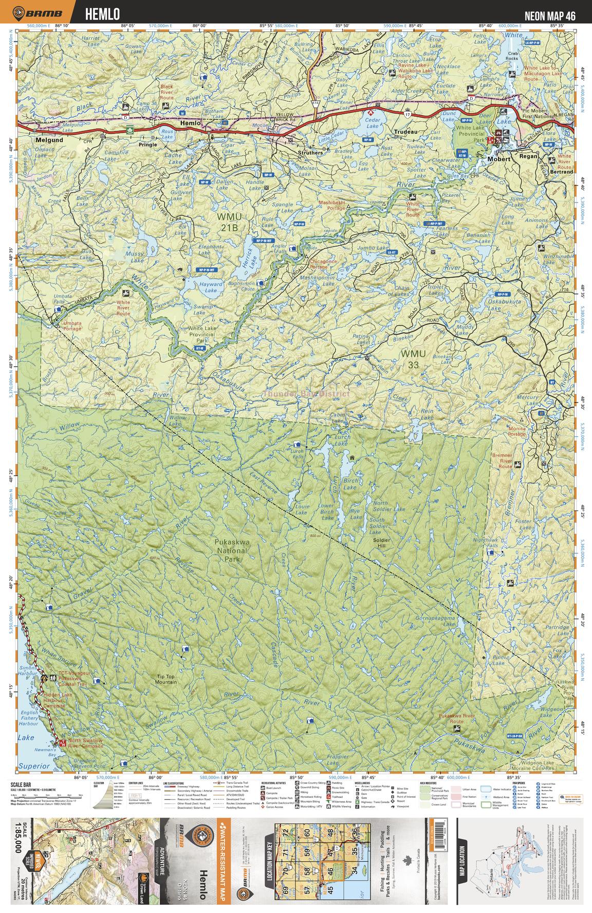 This recreation topographic map for Hemlo highlights all the logging/resource roads, hunting areas, fishing lakes & streams, campsites, paddling routes for canoeing and kayaking, wildlife viewing areas, multi-use trails for hiking, biking, horseback riding, cross-country skiing and snowshoeing, motorized trails for ATVing and snowmobiling & more. Covering 3,040 km2 (1,170 mi2), this 1:85,000 scale map measures 48 x 63.5 km (30 x 39.5 mi), providing you with more topographic and recreational detail for the Meldrum Bay area than any other map on the market. New features include Crown land areas, countless new roads and trails plus additional recreational Points of Interest. Included on this map are White River, Pukaskwa National Park, Pukaskwa River, Cedar Lake, Herrick Lake, Hayward Lake, Mussy Lake, White Lake, Rous Lake, Hemlo and more!