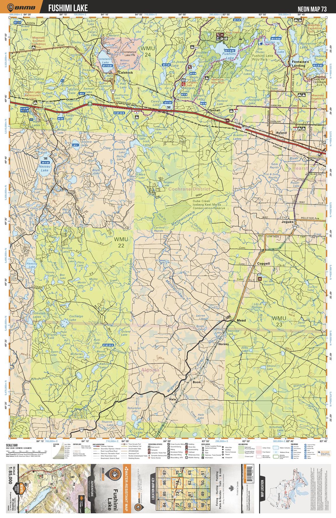This recreation topographic map for Fushimi Lake highlights all the logging/resource roads, hunting areas, fishing lakes & streams, campsites, paddling routes for canoeing and kayaking, wildlife viewing areas, multi-use trails for hiking, biking, horseback riding, cross-country skiing and snowshoeing, motorized trails for ATVing and snowmobiling & more. Covering 3,040 km2 (1,170 mi2), this 1:85,000 scale map measures 48 x 63.5 km (30 x 39.5 mi), providing you with more topographic and recreational detail for the Meldrum Bay area than any other map on the market. New features include Crown land areas, countless new roads and trails plus additional recreational Points of Interest. Included on this map are Fushimi Lake, Constance Lake, Nassau Lake, Valentine Lake, Mattawishkwia River, Valentine River and more!